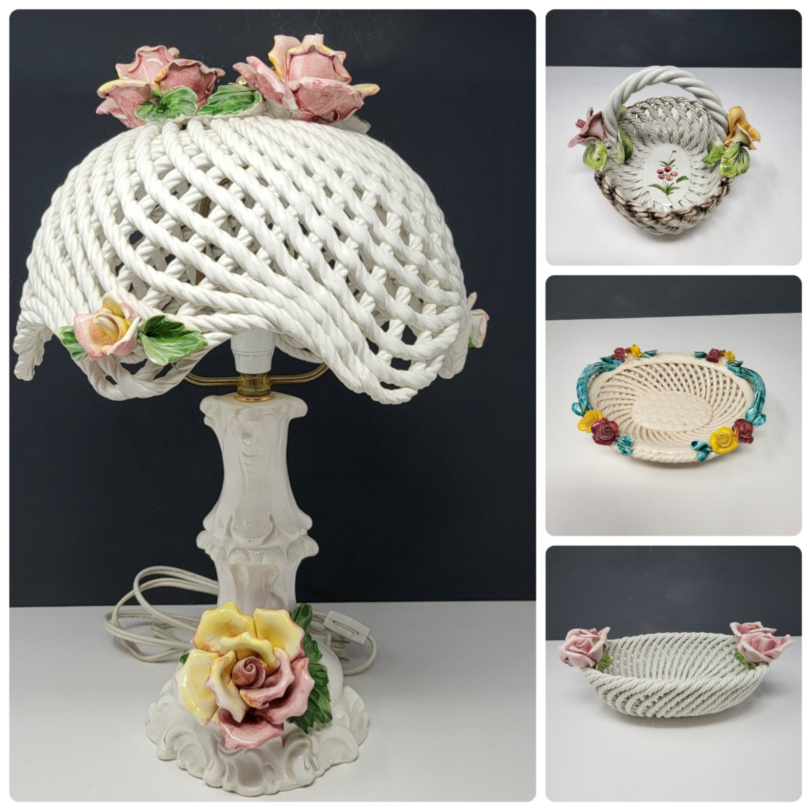 Made in Italy, Capodimonte porcelain lamp basket weave and flowers. Measures 17" tall, 6" at base, 11" x 7" basket weaved lampshade. Floral, twist handle basket, 6" x 5" Blue handles floral basket 7" x 6" 10" x 6" four roses basket