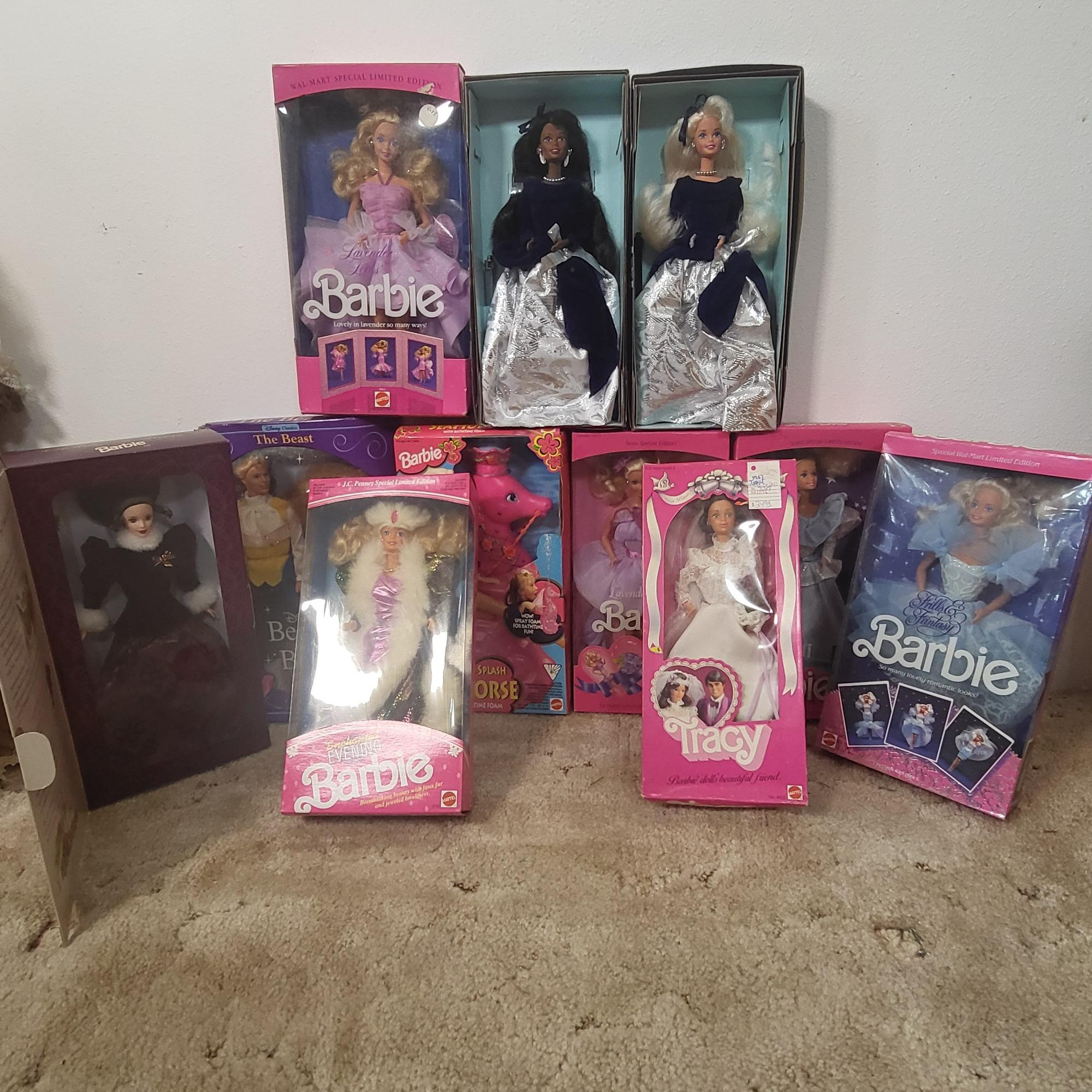 Various years, boxed Barbie's. 1982, Tracy. 1989, Lavender Surprise. 1991, Beauty and the Beast. 1994, Tropical Splash Seahorse. Frills Fantacy, Evening Enchantment, Holiday Traditions, Winter Fest.