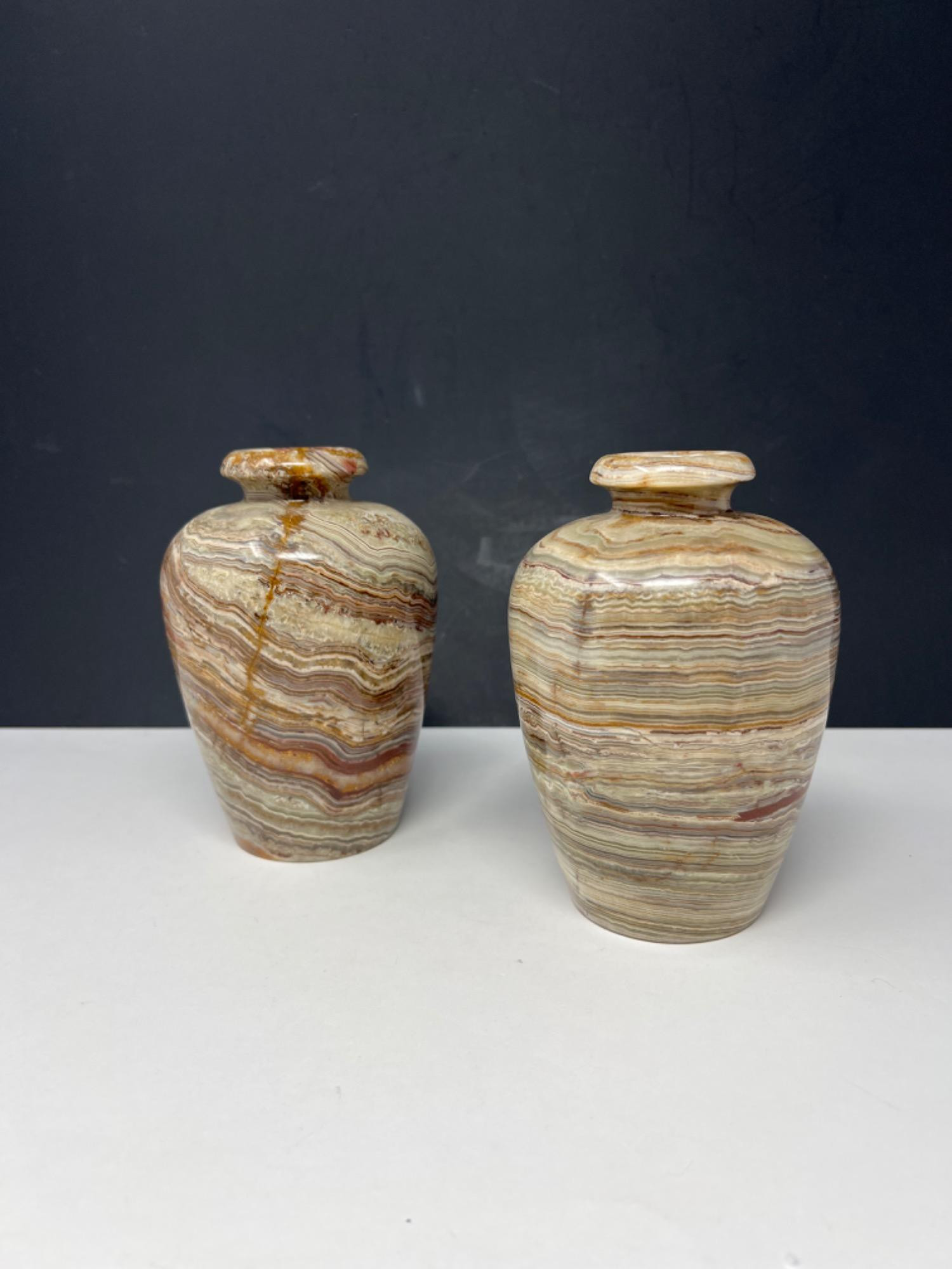 Pair of marbleized Onyx vases made in Pakistan. 6" height and 4.5" round. The lines and veins in the stone are various colors of burgandy, browns, burnt orange, white, tan and light grey.