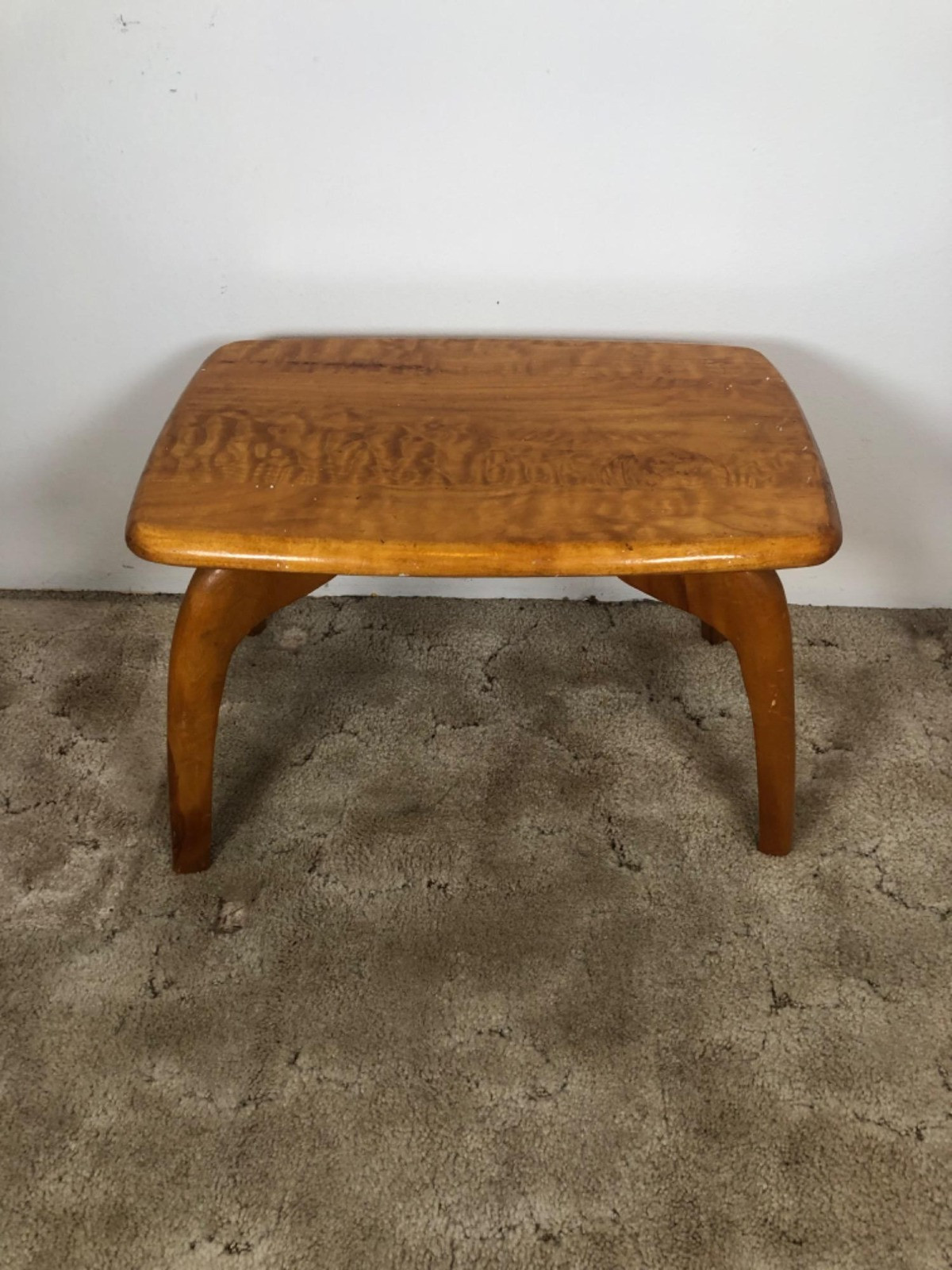 Burlwood MCM footstool with minimalist bowed legs. Beautiful coloring to wood and finely finished. Size: 13'H x 19.5"W x 13"D (a few white paint spots that potentially can be removed).