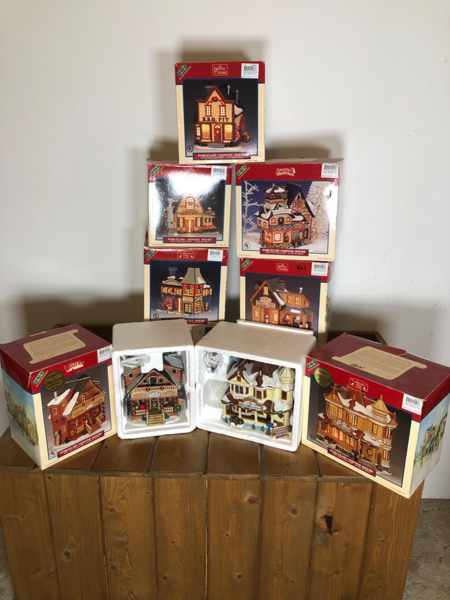 Lemax Lighted Christmas Village Collection - All with Original Boxes Lot Includes: B.B.Q Pit House Cedar Cabin House Bed & Breakfast House Cecil's Cider Mill House Elf Toymaking School House General Store House Chet's Carpentry House