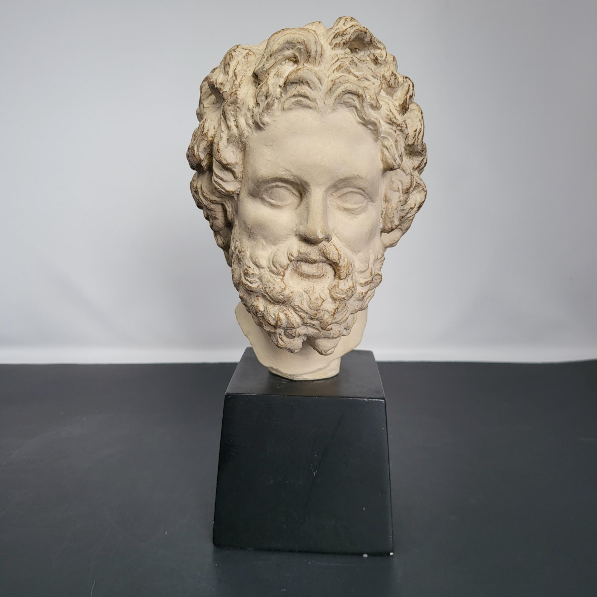 '59 Alva, Greek God bust sculpture. Overall measurements including stand is 11" Tall x 4.5" Wide