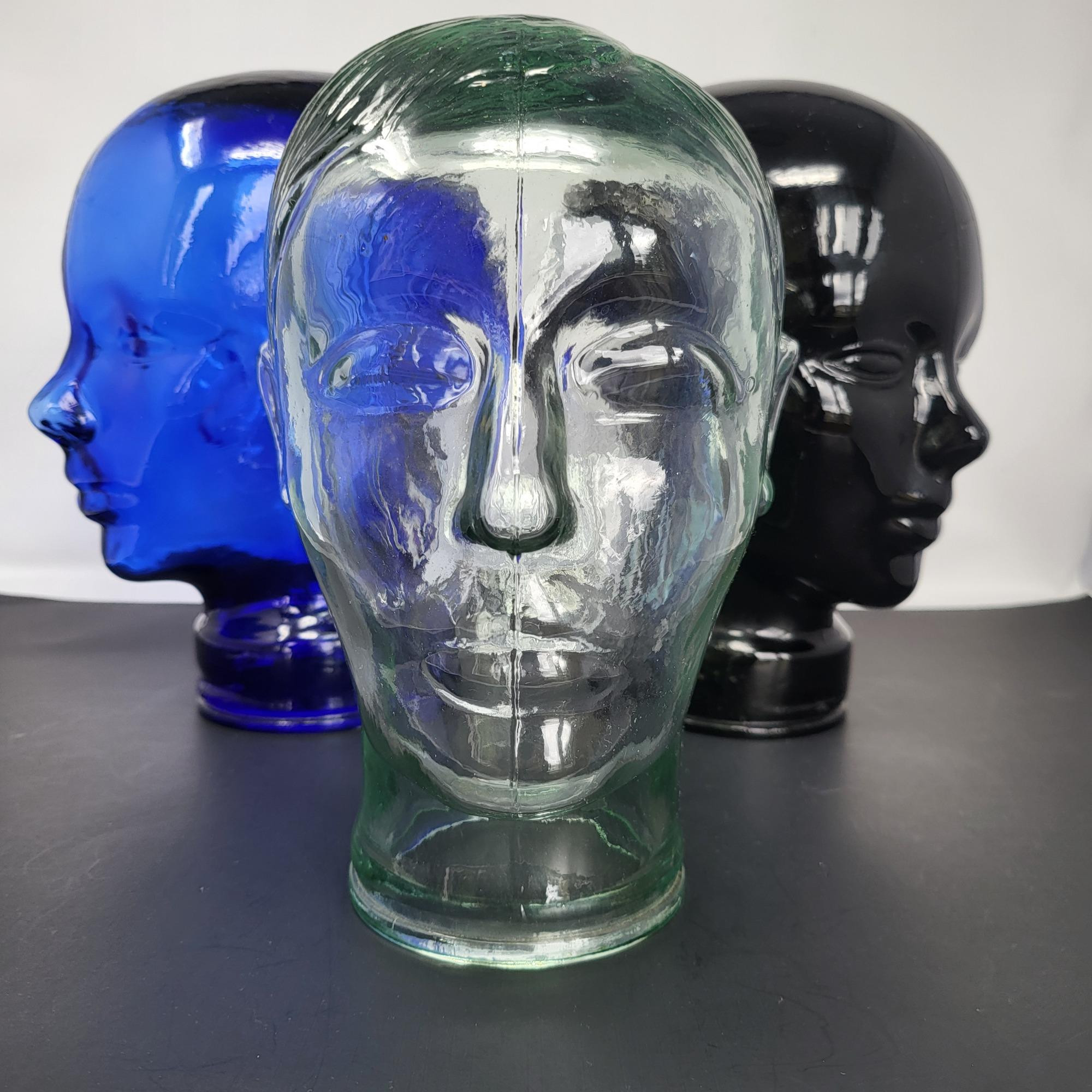 Trio of vintage glass mannequin heads: Two of the heads are 11" Tall (cobalt blue and black). The clear one is 10" and has a light green tint.