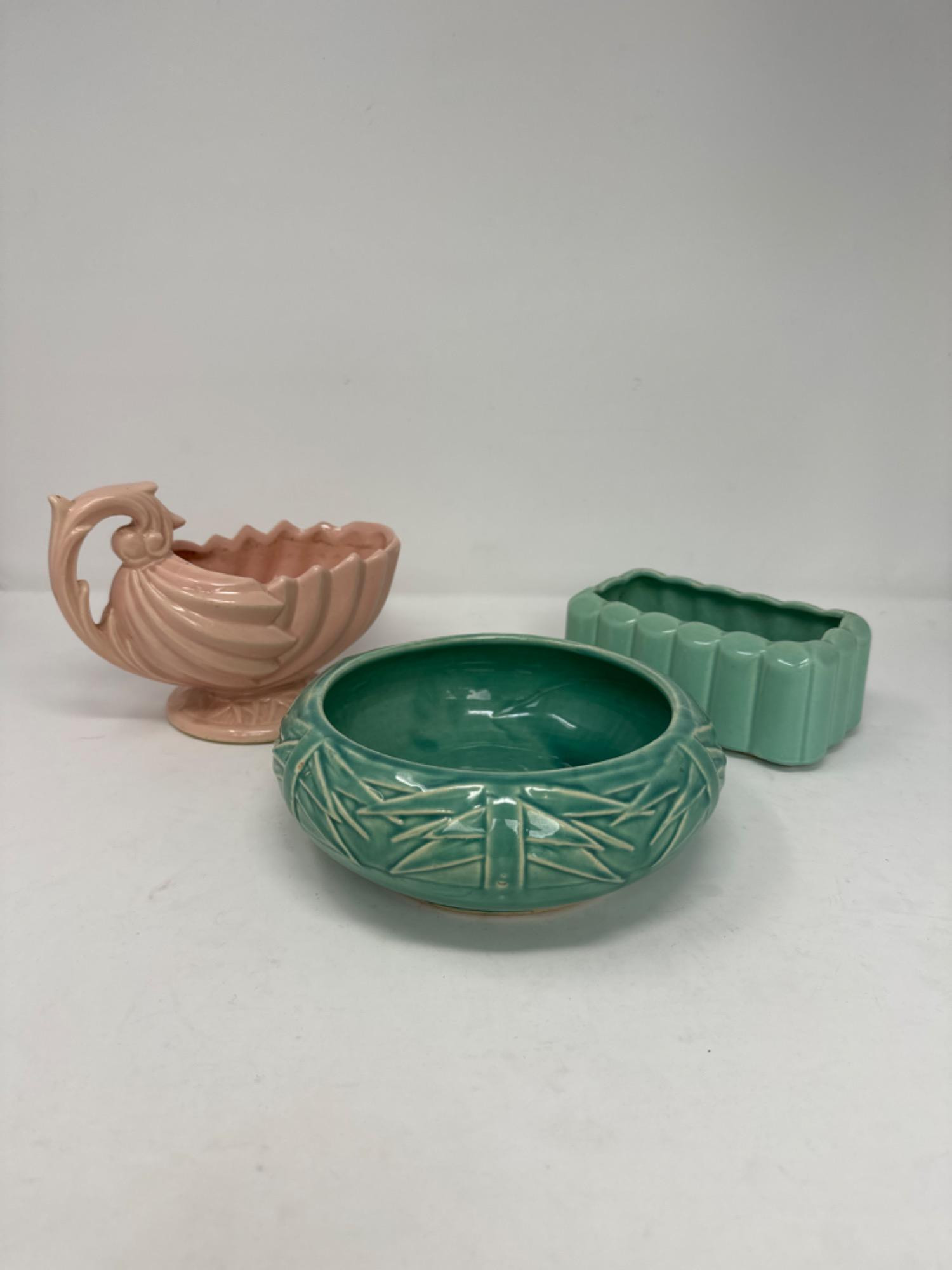 Vintage McCoy Pottery Planter Collection for the gardener or plant lover! Turquoise McCoy Flowerpot would be perfect for succulents, pansies, petunias, zinnia, etc... plants that bring a smile. The McCoy Pink pedestal planter has such a fun retro feel with beautiful smooth lines. The Turquoise Bamboo McCoy planter would be a great planter for cacti or succulents. Shallow turquoise McCoy flower pot measures at 8” diameter x 3” H. Pink McCou planter measuring at L 8” approx. x H 4” from base to rim, W 4” across body. Small turquoise Bamboo planter measures at L 6.5” x W 3.5” x H 3”