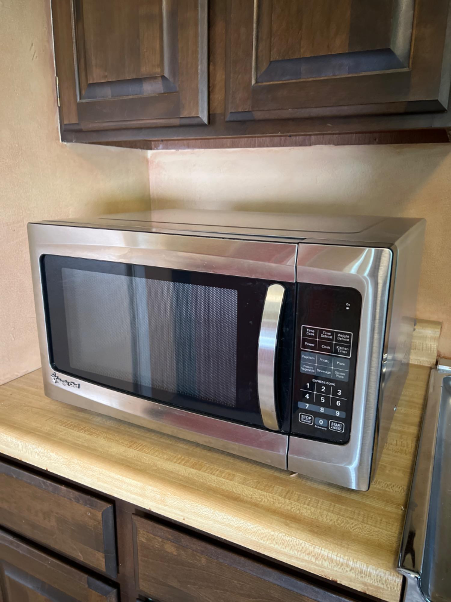 1.6 cubic feet countertop microwave in working condition. Overall measurements: 22” w x 16” deep x 13” tall; interior 9” high x 14.5” wide x 15” deep. 13.5” Turntable, 30 sec timer, kitchen timer, white interior, and stainless steel exterior.