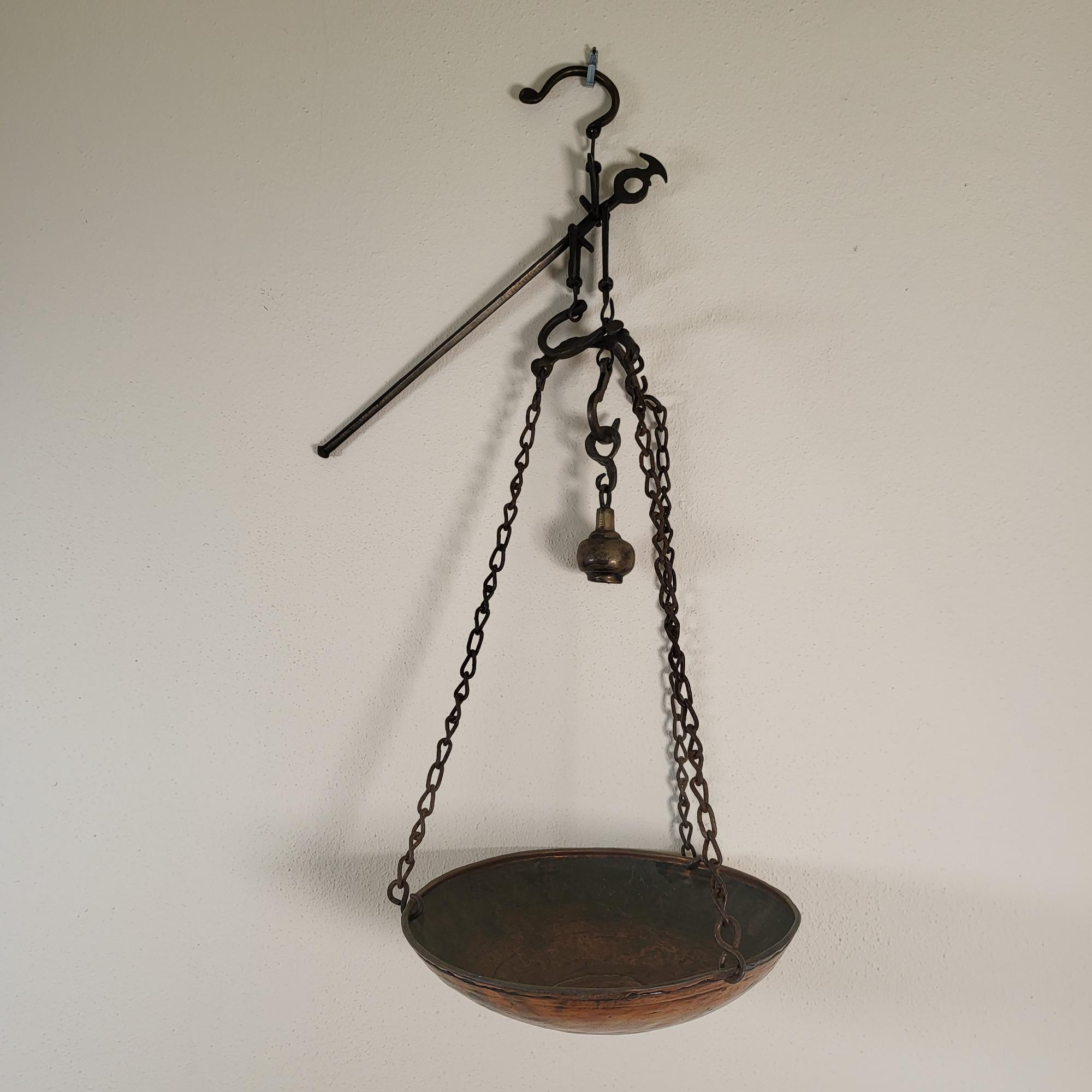 Really cool, old, copper and iron steelyard balance from late 19th century or early 20th century. It has a 9.5" copper bowl, is 26" Tall. Rustic iron chains and brass weight.