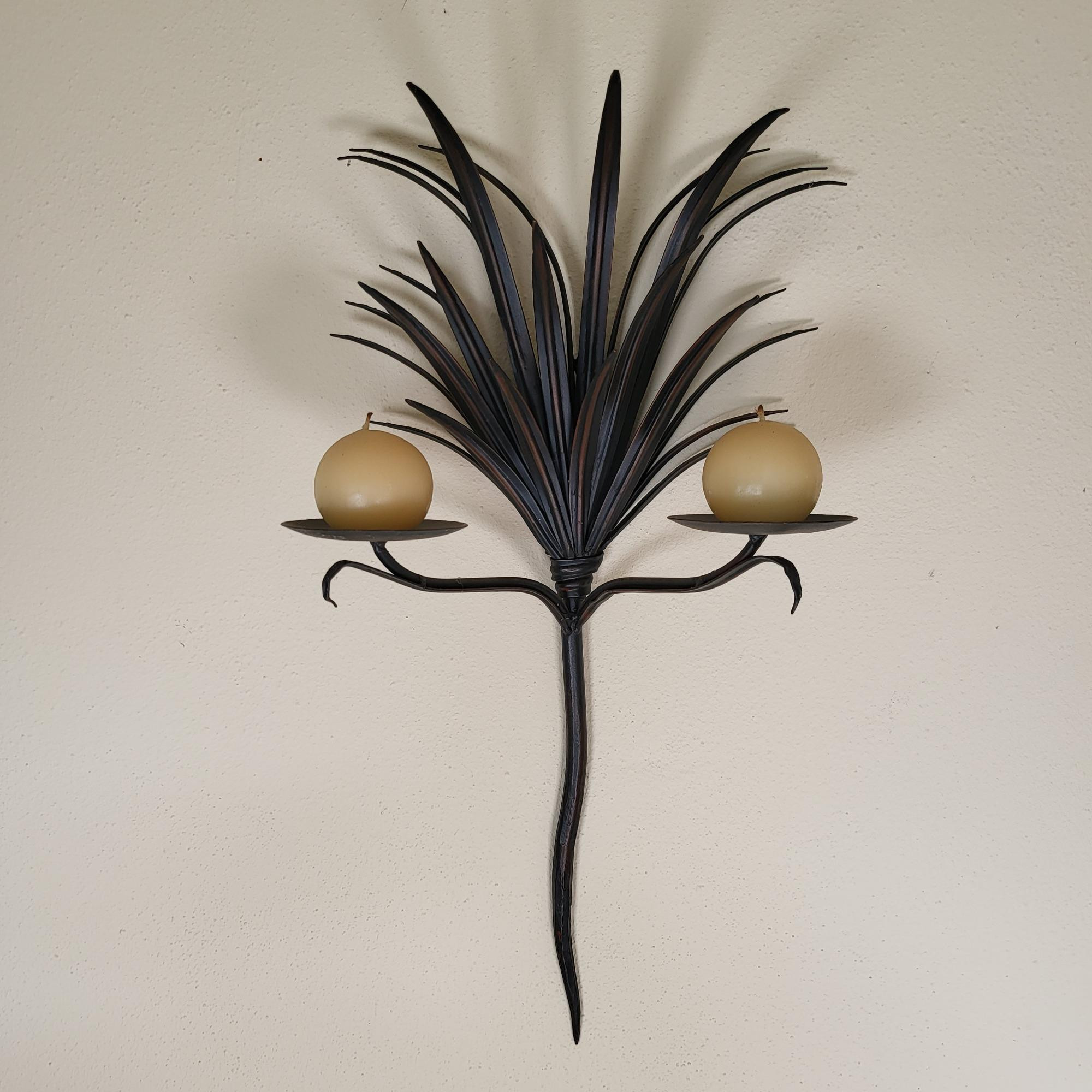 Leafy metal sconce is 21" Tall x 11" Wide x 6" Deep. Candle holder has a spike to keep candle in place and is 3.5" diameter, so can hold a variety of sizes.