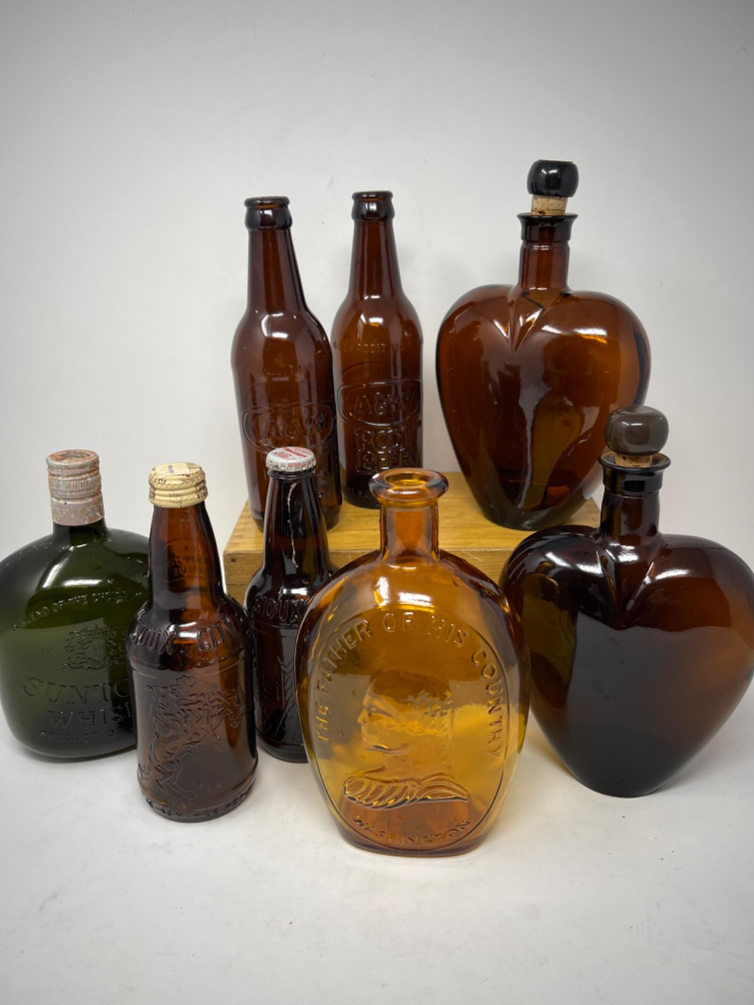 9” tall brown, amber soda & liquor bottles and one green whiskey collector bottle (all empty) - A&W Root Beer, Sioux Falls Sasparilla and Cream Soda.