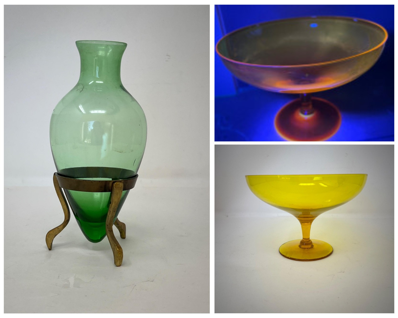 Yellow Blenko Style Pedestal Bowl and Green Bee Vase add a fun touch to your house decor. Place in a window or where the sun will shine through to brighten up a room. Create beautiful floral center pieces to add a finishing touch. Add decorative balls or apples to fill up the yellow pedestal bow. Great gift idea for yellow or green lovers. Yellow Bowl - 8” diameter x 5.5" tall Green Bee Vase - 7.5” tall x 4” diameter