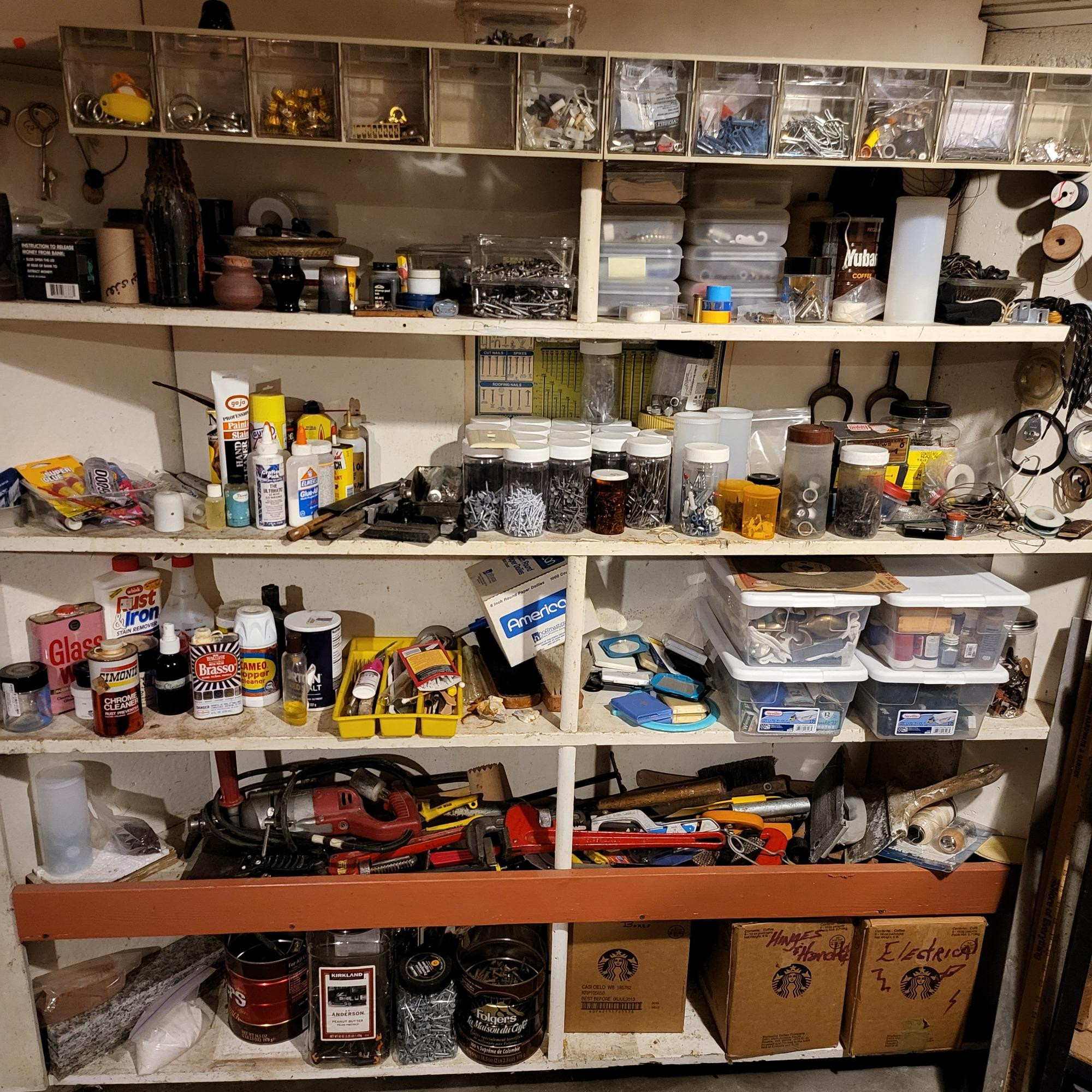 All the tools, nails, screws and much more on wall shelf. Ideal for household projects, art projects, modeling projects, painting projects or home repair. Trim down that "honey-do" list or start a new project. Especially great for new home owners who don't have many tools or materials for making upgrades & repairs.