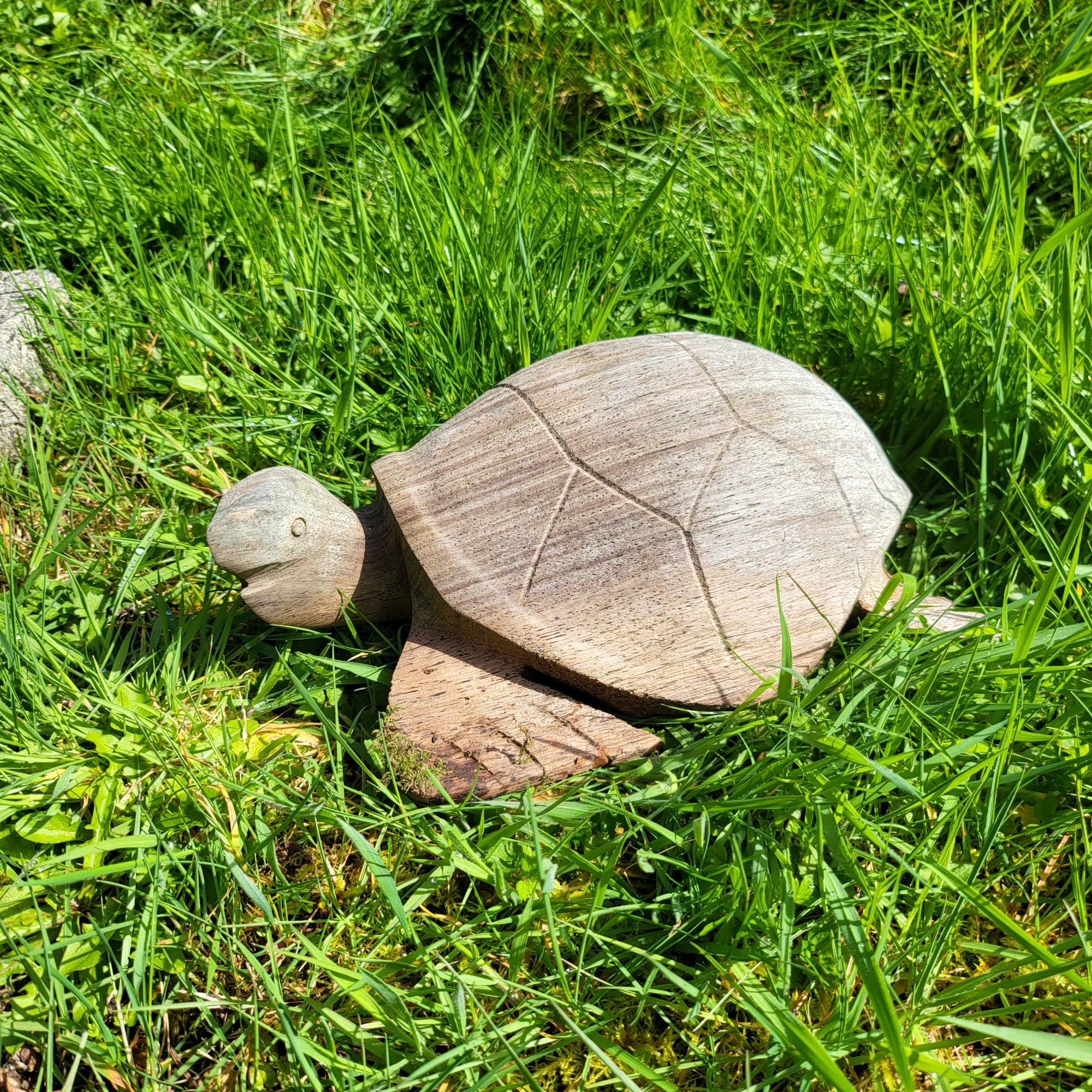 Teak wood carved happy turtle garden art is a cheerful addition to extend a greeting to a home, a yard, a garden or inside a home. Turtles are known for their patience, longevity, good fortune & prosperity among other positive things. Hawaii or beach fans love turtles as they remind them of their happy places. 11" Long x 7" Wide x 4" Tall.