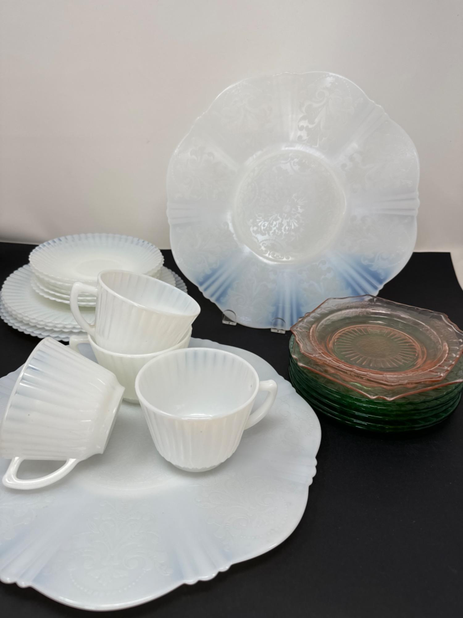 American Sweetheart Monax chargers (2) were made by the MacBeth-Evans Glass Co. during the Great Depression between 1930 & 1936 and valued for it's historical significance, American Sweetheart Depression Glassware. The MacBeth-Evans Monax Petalware Collection was first produced in 1930 and into the 1940's. Set of 6 Green depression dessert plates, Imperial Glass Co. Twisted Optic pattern. Mayfair Pink depression glass dessert plate by Anchor Hocking (?), pattern made between 1931-1937. Pink Optic design plate some scratches and wear. American Sweetheart Depression Glass set of 2, 11” diameter. Green Depression Glass 6pc set of dessert plates, Imperial Glass Co. (?) with the Twisted Optic Swirl pattern measuring at 6.5” diameters. Mayfair Pink by Anchor Hocking small plate (1pc) measuring at 5.5” diameter. Pink plate (made by?) Optic design measuring at 6.5” diameter.