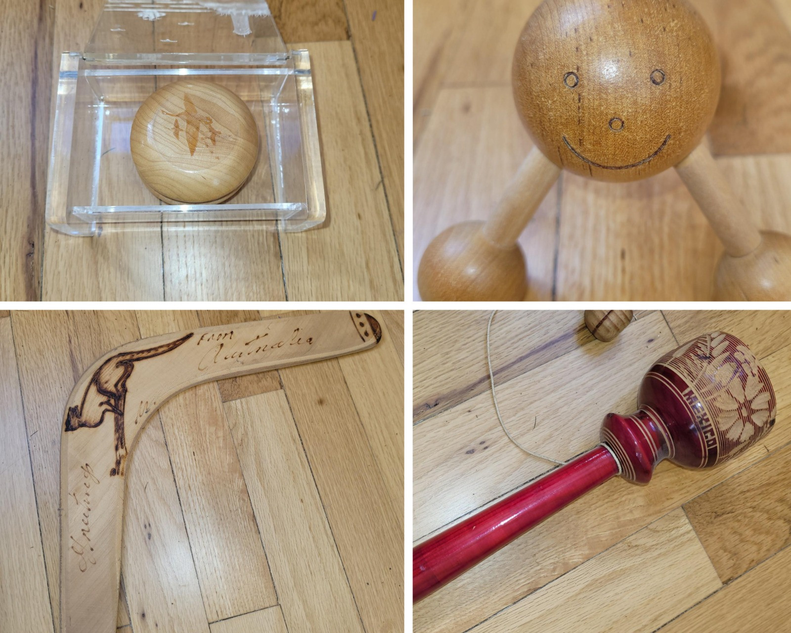 From train whistles to wood carved boomerangs and from a rice filled frog to bouncing balls, enjoy the era of entertainment requiring ingenuity and coordination! Includes wooden yo yo in acrylic box, boomerang, ball in cup made in Mexico, and Happy Time wooden massager. A rice filled microwaveable frog to warm up your muscles, rubber baseballs and zag or juggling balls, and more.