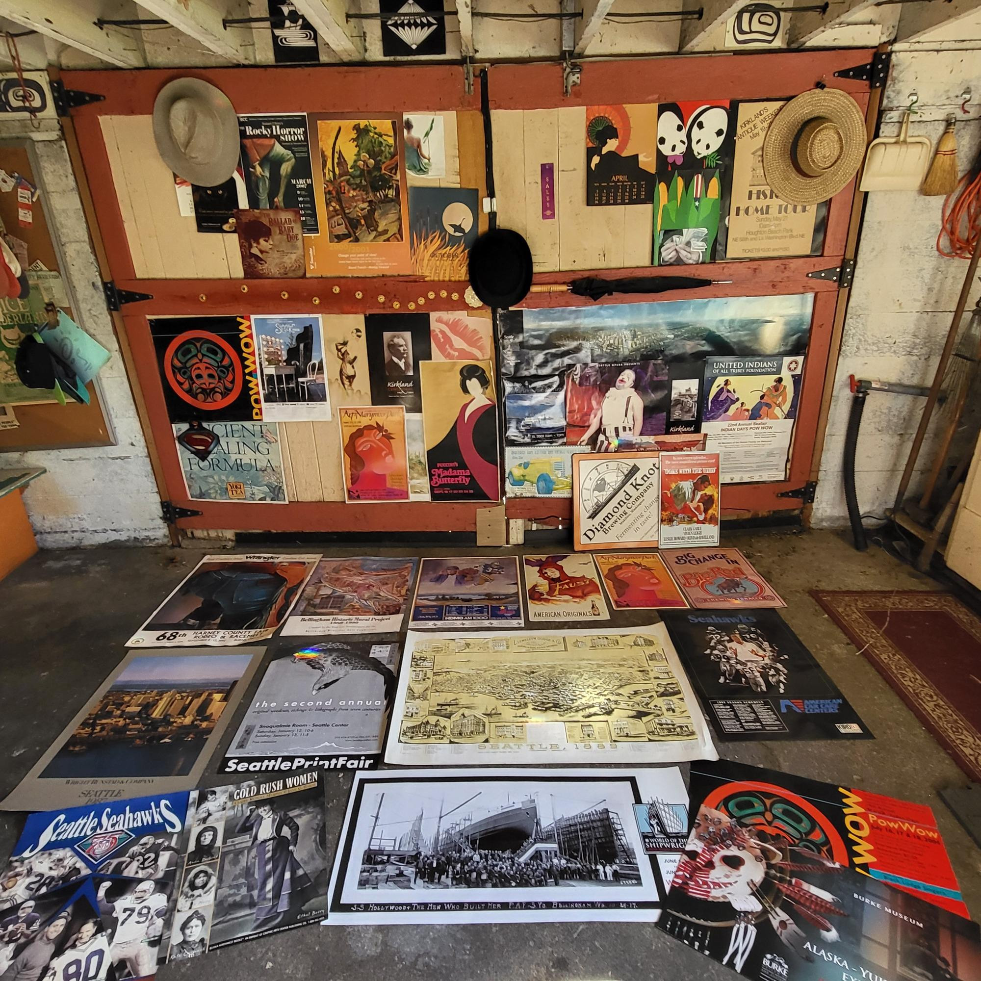 Various advertisement posters, two tin signs, several vintage hats & umbrella. Wrangler jeans, Seahawks, 1889 view of Seattle map, Madame Butterfly, local festivals - Posters Diamond Knot Brewery and Gone With The Wind, tin signs. Some of the posters are tacked on doors by push pin, so will need to be carefully removed. Buyer removes ALL!