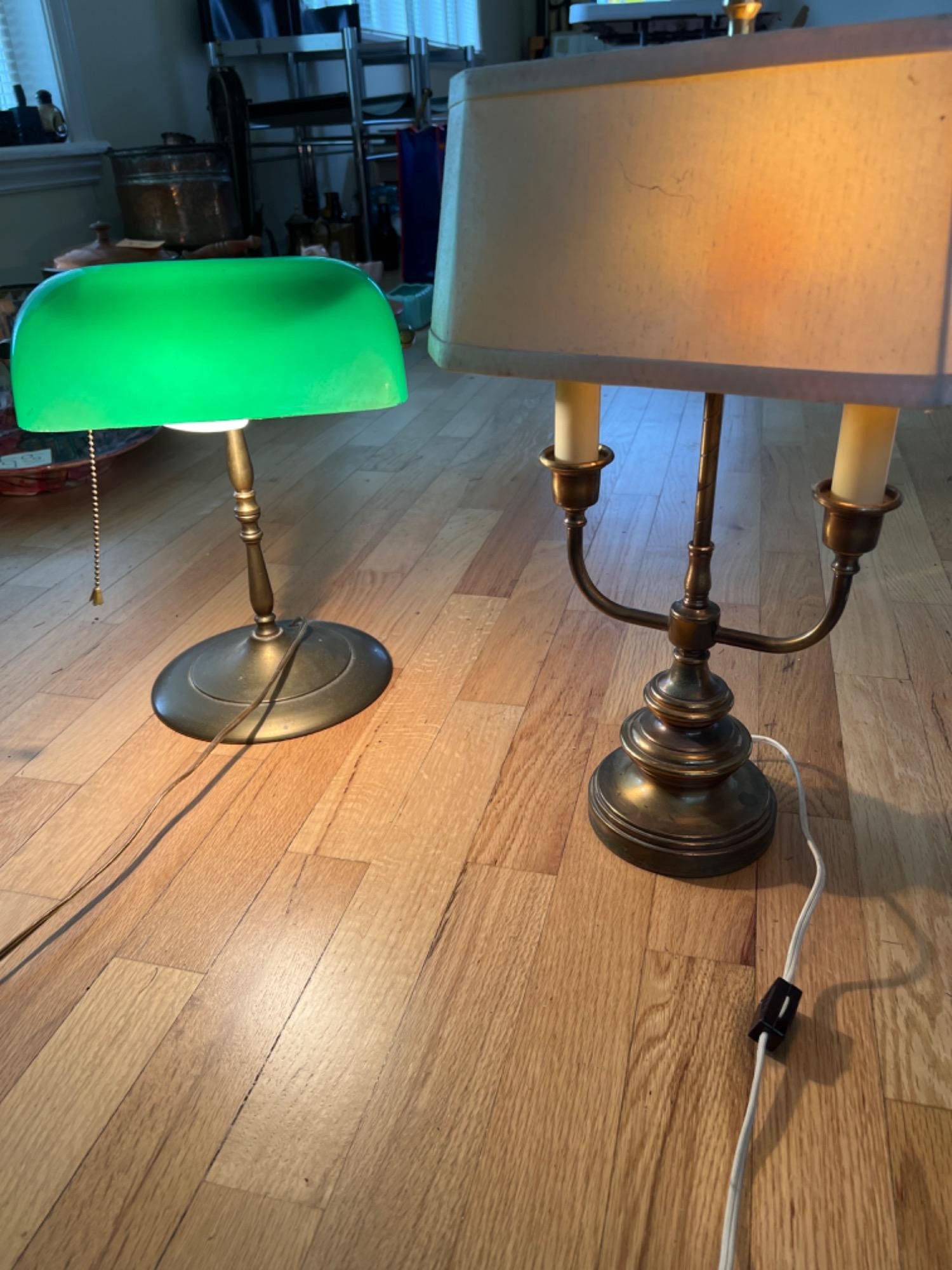 Bankers green glass desk lamp (13” tall x 20” wide) and double bulb brass base toggle switch bedside lamp (18” tall x 8” wide -12” wide shade).