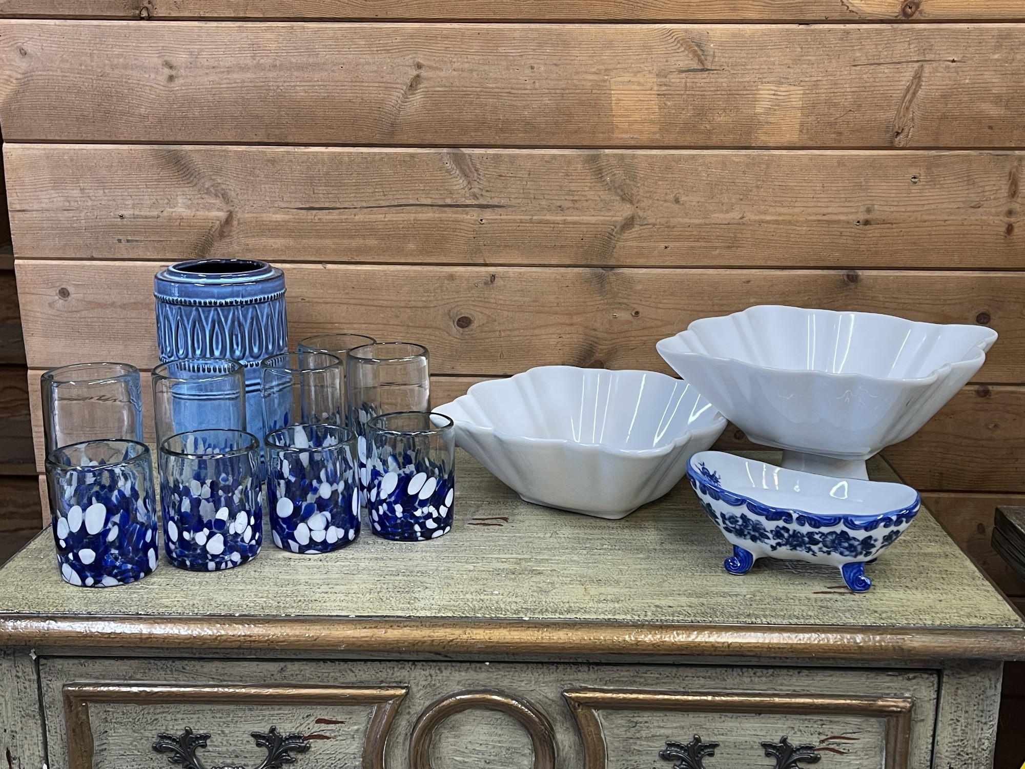 Hand Blown Blue & White Confetti (4)Lowballs & (5)Tumblers Ceramic Tub Dish Soap holder White ceramic pedestal bowl and bowl - each are 11W"x11"W Modern Mid Century inspired ceramic vase Sizes range from 2.75"T - 8.5"T