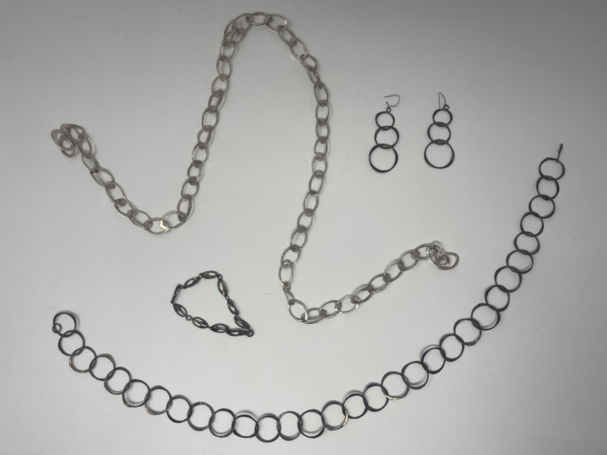 Verified by jeweler Weight: 120g total Light silver chain: - Length: 39 inches Dark silver chain: - Length: 25 inches Earrings: - Length: 2.5 inches Bracelet: - Length: 8 inches All chains need cleaning but in otherwise good condition
