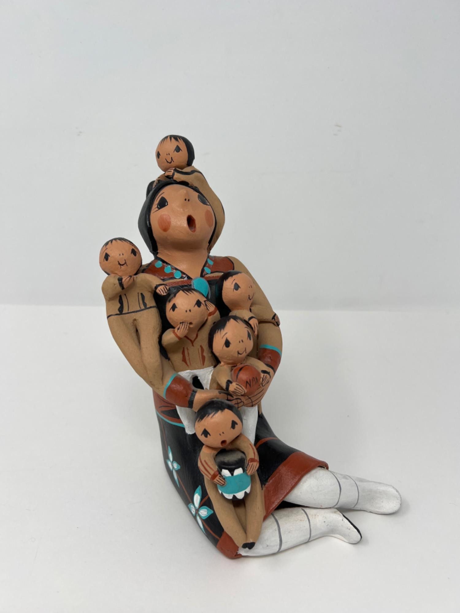 Excellently handcrafted Jemez Storyteller Native American pottery figure of a mother singing to her children as she holds them was made & signed by J. Lucero. J. Lucero was an Elder in the Isleta Indians located in Isleta, New Mexico and a singer songwriter who often played music at his reservation. Storyteller dolls have taken the place of historic figurative pottery and has become a popular collected Native American art form. The Storyteller is in honor of how generations of American Indians passed down their history and stories to younger generations through oral storytelling. The Storyteller piece measures at 8” tall x 5” deep x 4” wide. [PA]