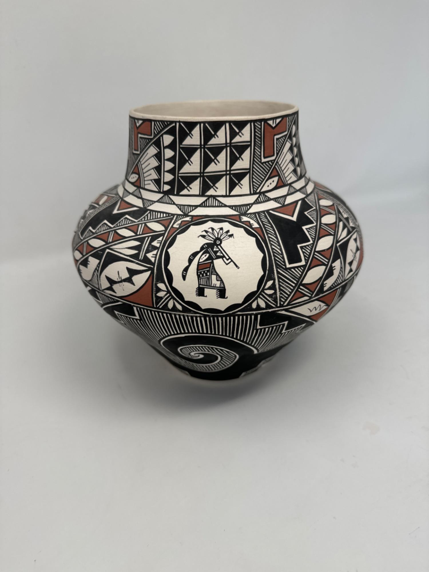 Pueblo Pot made by L.Vallo (Leland Robert Vallo “Pinion Mesa”), born into the Acoma Pueblo. He was inspired by many famous artists, like Dorothy Torivio, and continues the long tradition of hand coiling pottery using ancient methods. He began making pottery in 1991. This beautiful piece would be an amazing addition to anyone's collection, office or home. Measures approx. 8" H x 4" diameter at top, 3.5" diameter at bottom. [PA]