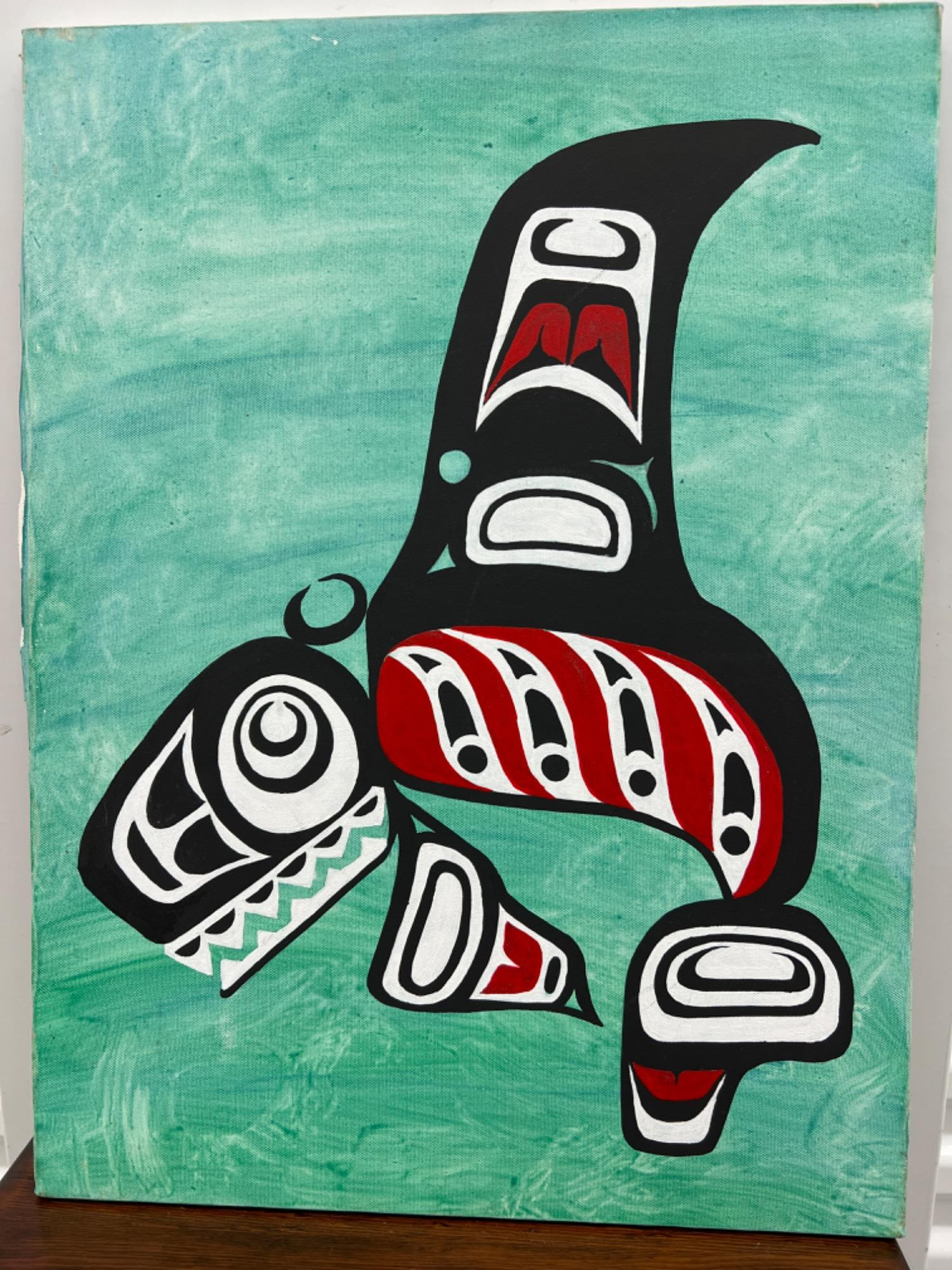Original painting on canvas by Don McCale and signed on back "McCale 1999". Depicts Northwest Salish tribal style Orca Whale (killer whale) design. 18” wide x 24” tall [DM]