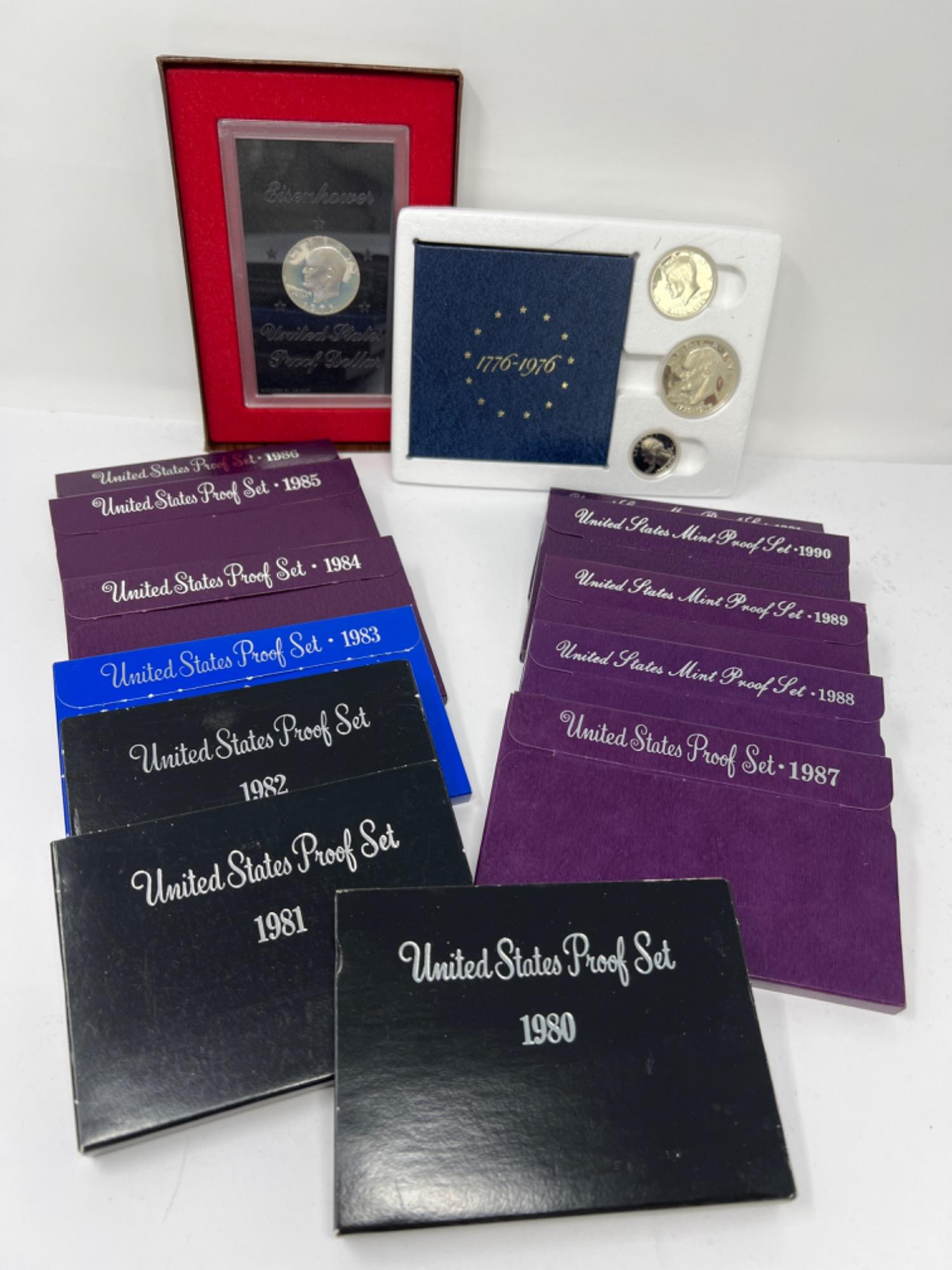 1980- 1991 United States proof sets in original cases. Eisenhower 1973 Eisenhower Silver Dollar Bicentennial United States Proof Set in original case - 1776 - 1976, Eisenhower Silver Dollar, Kennedy Half Dollar and Washington Quarter (1976) [MDV]