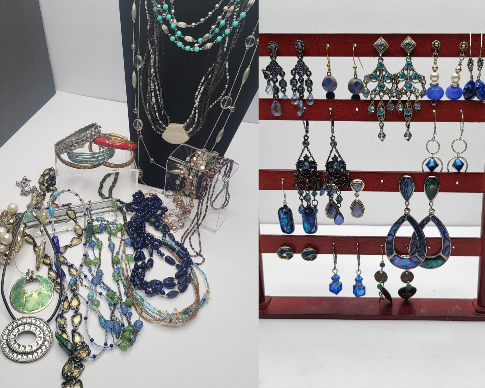 Fashion Jewelry Variety of Necklaces, Earrings & Bracelets. Mostly blues & greens with beads, rhinestones and more. Few are Chico's brand. Assortment of necklaces single and multi strand in various lengths. Many are 80's & 90's. [PP]