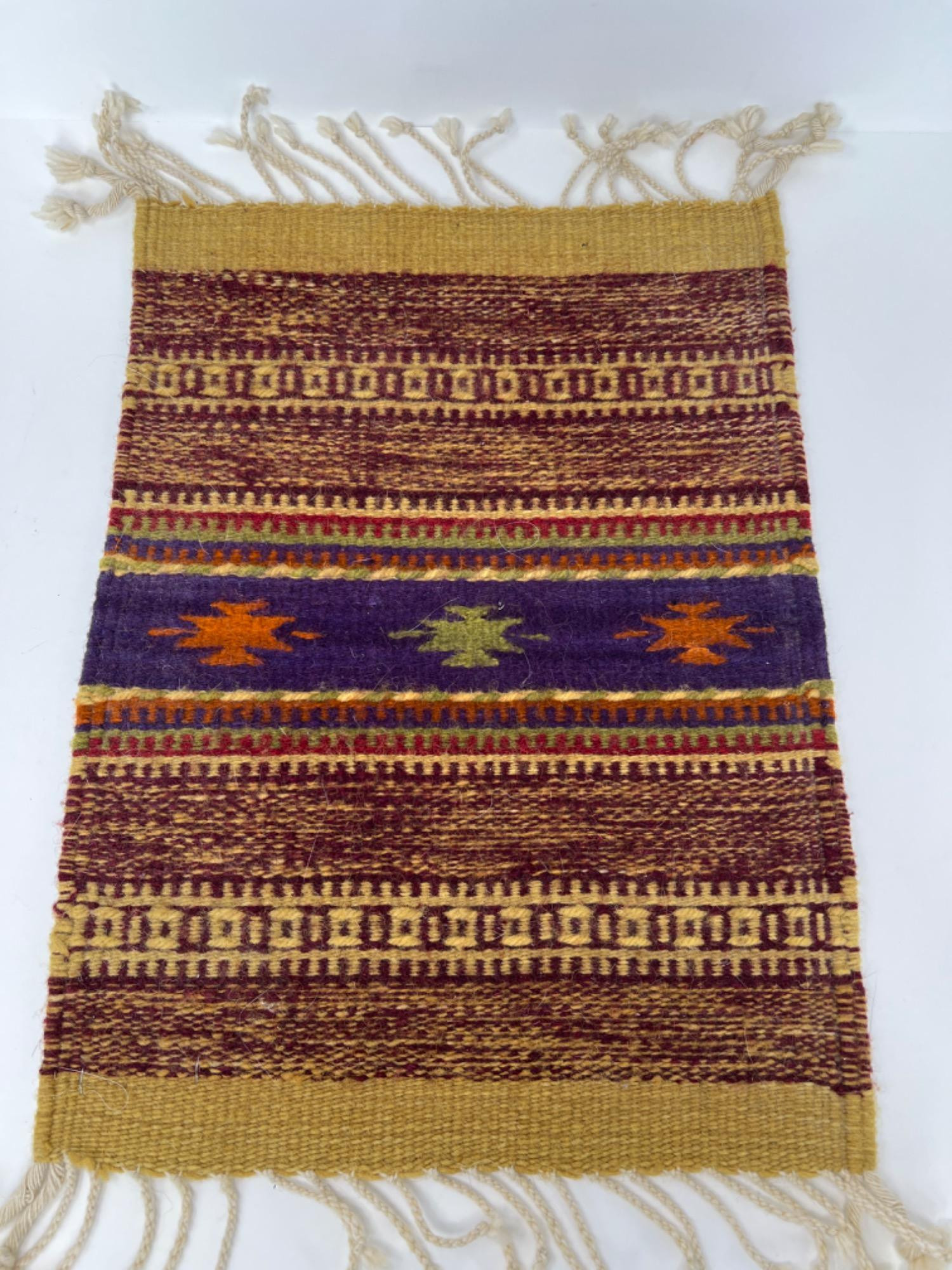 Handwoven in Teotitian Del Valle, Oaxaca, New Mexico. Blend of tan, burgandy, rust, green, orange, red hand-dyed 100% wool strands. From The Zapotec Collection. size: 18” long x 13.25” wide [PA]