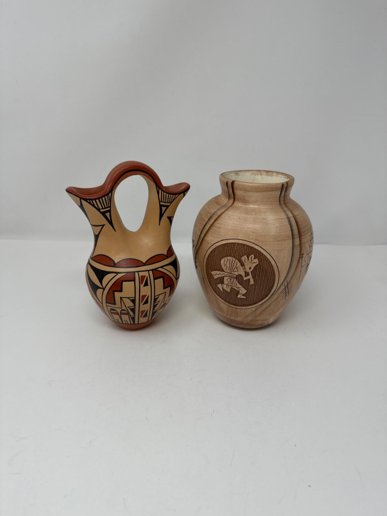 Wedding vase measures at 6" H x 3.5" approx. diameter. Navajo Pot measures at 6" H x 4.5" approx. diameter. [PA]
