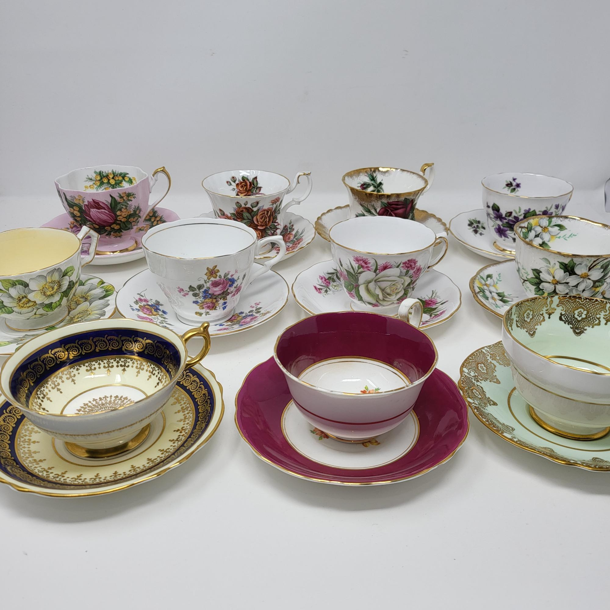 11 vintage & antique fine bone china tea cups and saucers. Makers include Queen Anne, Aynsley, Royal Albert, Royal Vale, Paragon and more. [PA]