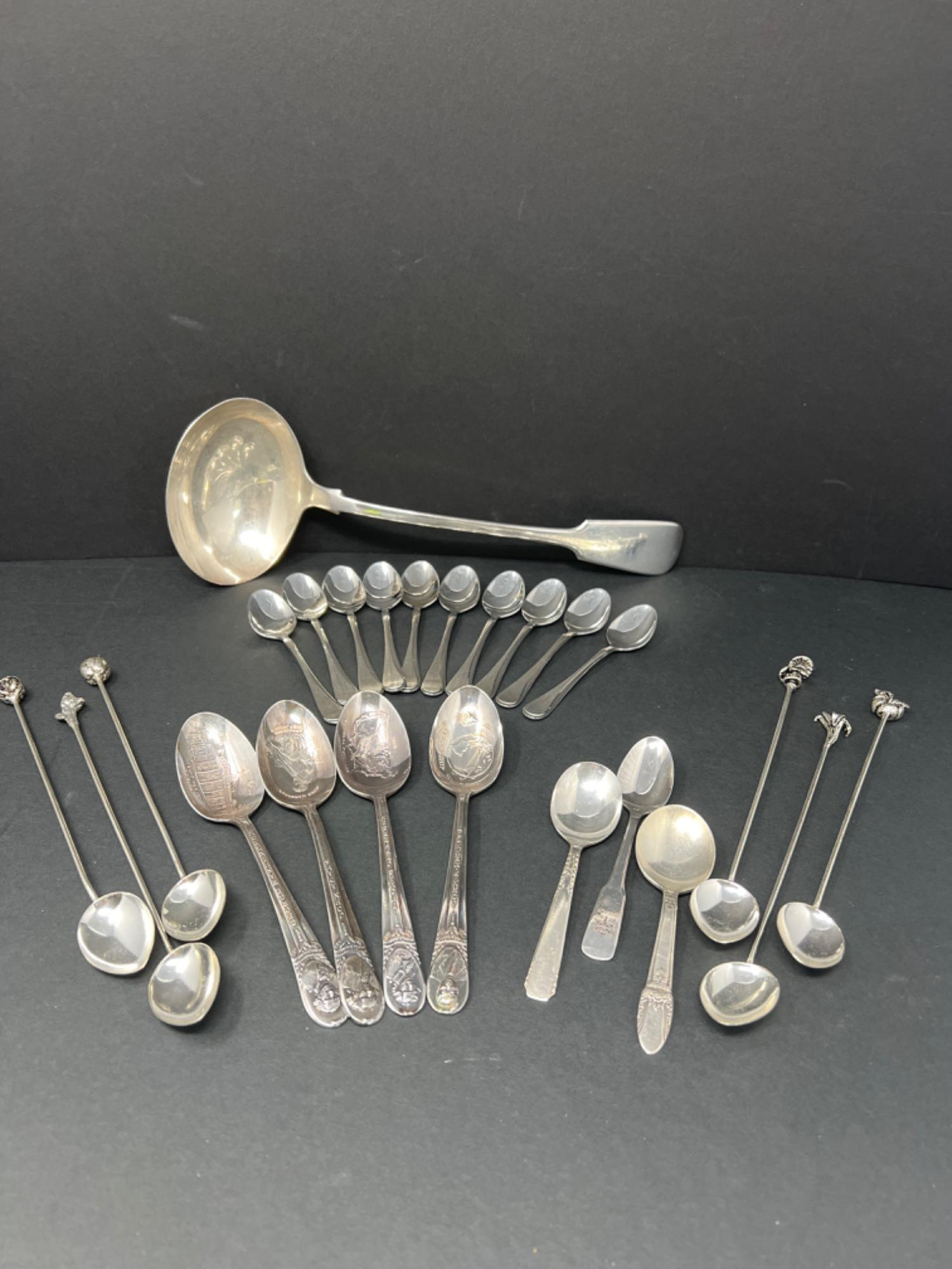 Small serving spoons and ice tea spoons, large punch ladle, and collector Presidential spoons. Believed to be silverplated. [MDV]
