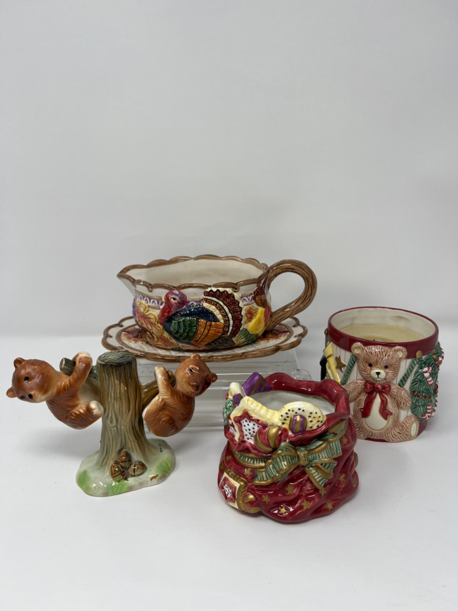 Salt and Pepper - Victoria Ceramics, Japan, bear shakers hang from ceramic tree. 4” tall x 6” wide overall. Toyland Santa - Fitz and Floyd, 4” tall x 3.5” round Candy Lane - Fitz and Floyd, 3.5” tall x 3” round Thanksgiving Gravy Boat and Resting Plate - Omnibus, Fitz and Floyd, Turkey motif, 8” long x 6” wide x 3.75” tall overall. A few minor surface chips along edge of gravy boat and plate.