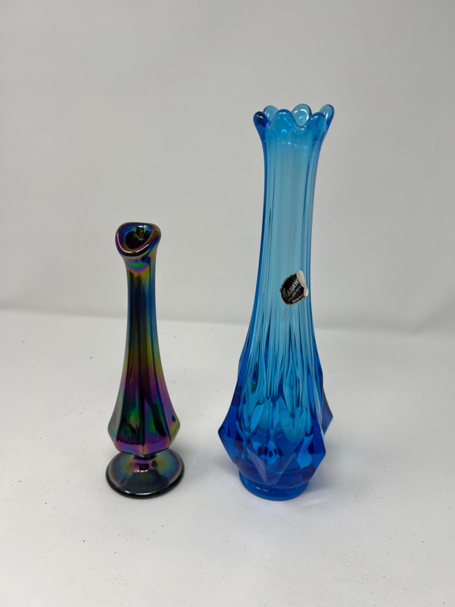 Mid century Fenton iridescent 8" tall vase. Kanawah handcrafted 10.5" tall glass vase with scalloped edge.
