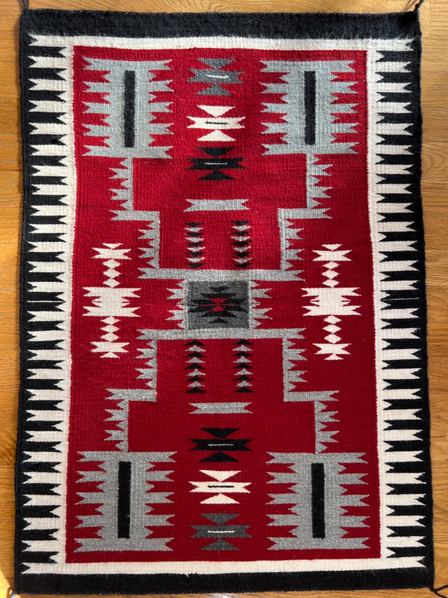 The Ganado Red Navajo Rug is a well woven rug with deep red background and black border. This rug was woven by Charlene Begay (American Indian Textiles, page 45). The Begay family are well-known for their weaving artistry and often hand-dye their wool strands as well as hand weave. Charlene called this rug “Storm”. Purchased at The Eagle Dancer, Manitou Springs, Colorado, September 2002, $507.