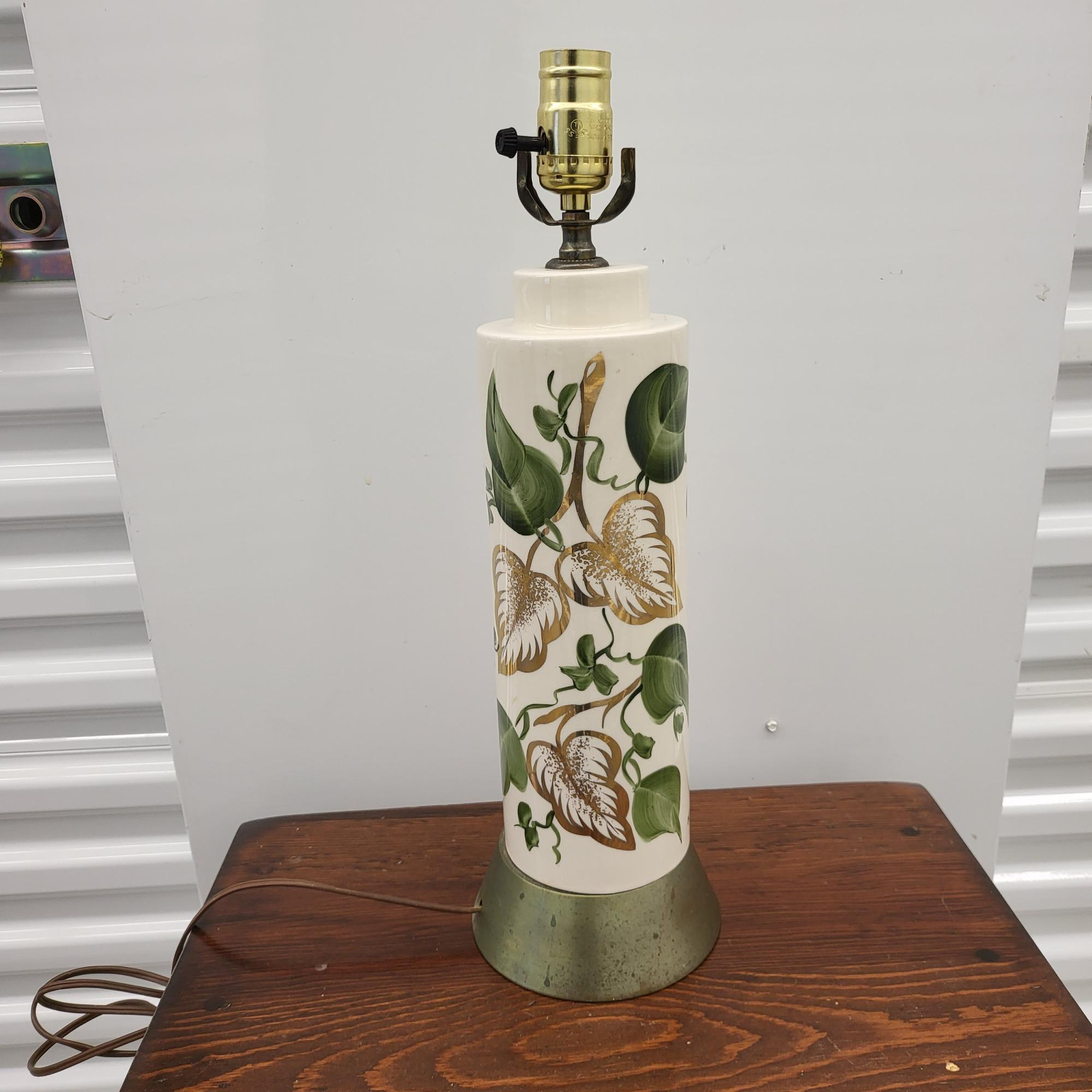 Green & gold hand painted leaf design, ceramic lamp on brushed metal (brass) base. Signed Hig. Measures 18"T x 5.5"W at base. Has vintage electrical cord, untested. No shade. [PP]