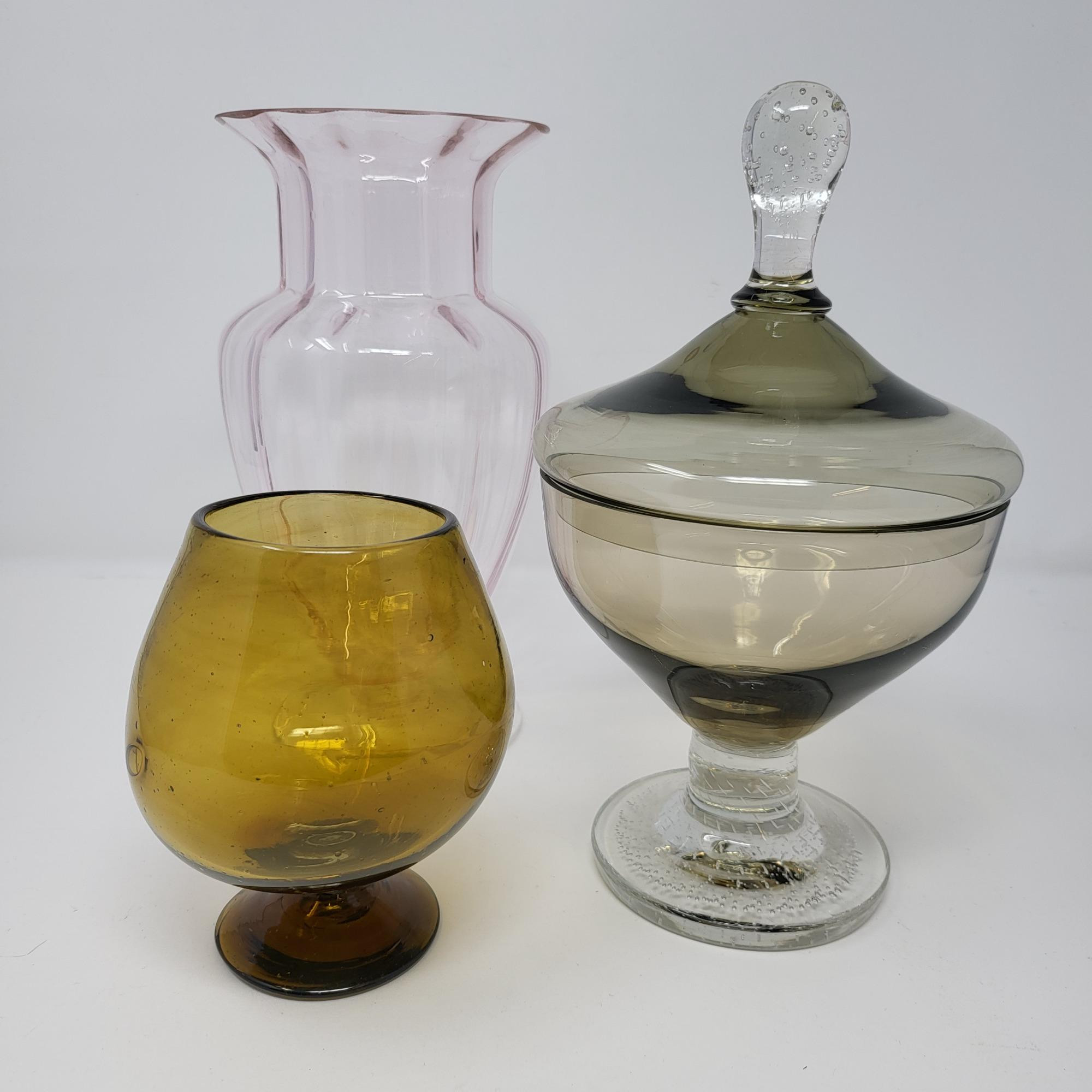 Light pink Deco style vase is 9.5" Tall x 5" Wide. Possibly a ribbed Baluster Vase. Smoky and bubble glass lidded comport is 9.5" Tall x 5.5" Wide. A couple very tiny, hard to see knicks on rim. Amber handmade glass goblet is 5.5" Tall x 4" Wide. Opening is a little narrower at 2.5". [DM]