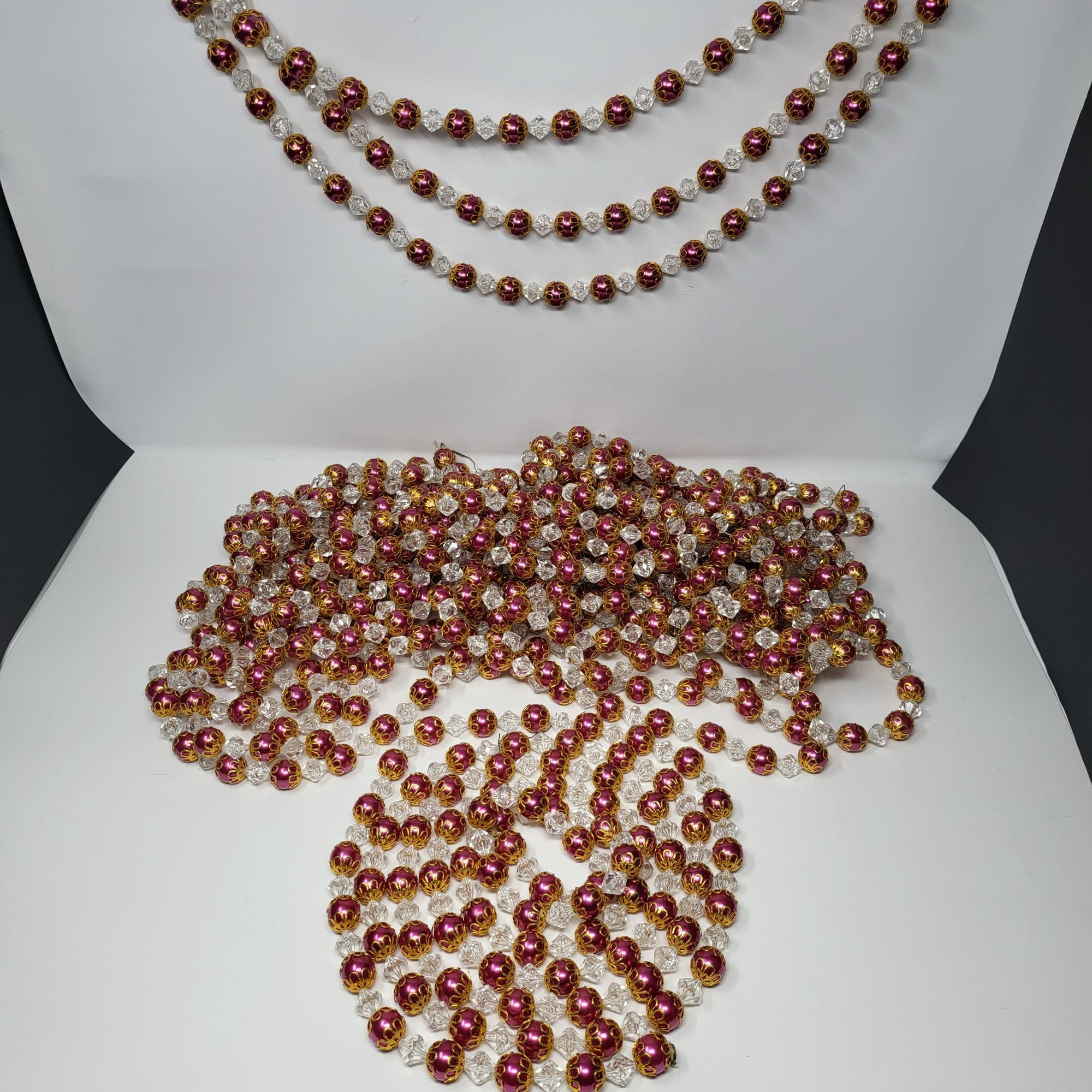8 strands of vintage garland, each measure 106" long. Garland, shimmery pink with gold filigree, and clear acrylic crystal beads. [DM]