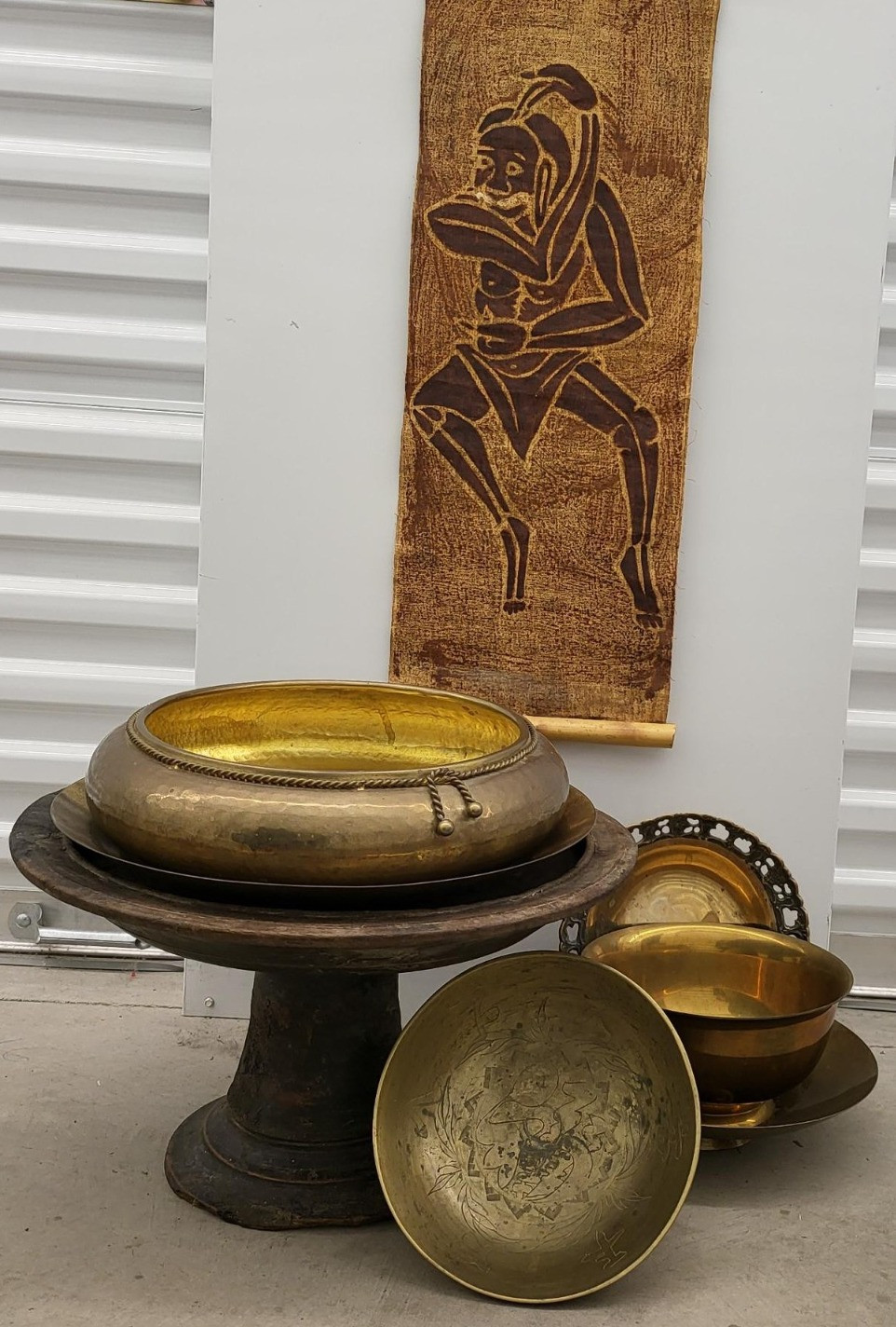 A variety of large brass bowls and a rustic wood stand that measures 14" w x 10" t. The brass bowl with brass rope trim is 12" diameter x 3.75" T. Other bowls measure 8" round to 10" round. 33" long x 8" wide scrolled fabric print of Tahitian dancer. Scroll is supported on each end with bamboo fitting. [DM]