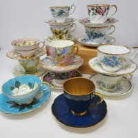 Lot of collectible bone china Made in England tea cups and saucers. Variety of colors and patterns. Some makers are Paragon, Royal Stafford, Shelley and more. Most cups are 2.25" tall and saucers 5-6" round. [PP]