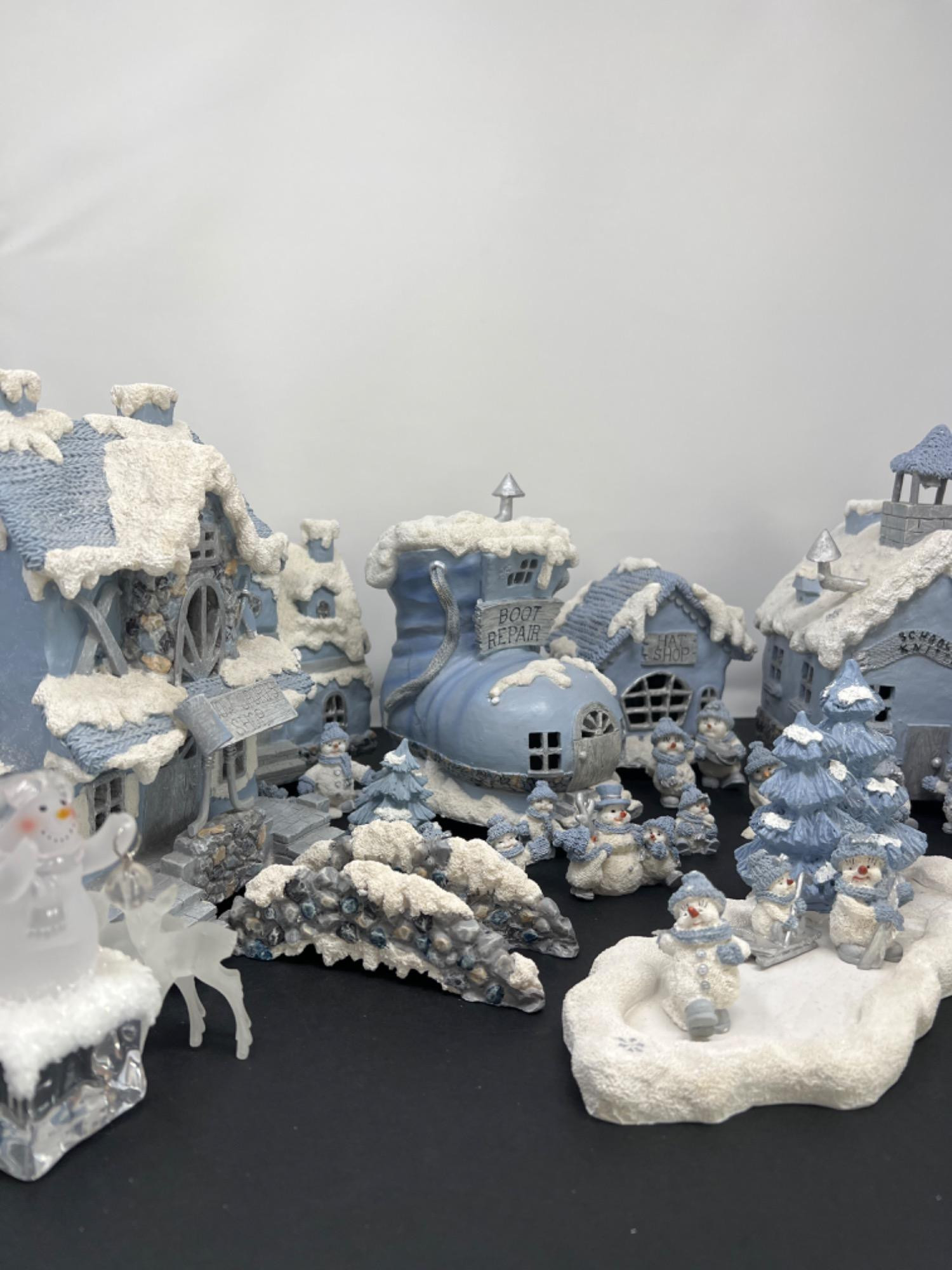 Snow Sports Shop, The Flurry’s, Boot Repair, Hat Shop, School of Knitting, Snowville Church, Sno Cone Hut. One large 6” tall tree and 4 -2.5” trees, Ice Pond 9” long x 4” tall, 4.5” long Stone Bridge, 22 - 1.5” tall to 3” tall snow people. Missing lights and cords for buildings. Buildings range from 6” - 8” tall. BOXES for houses included. [PA]