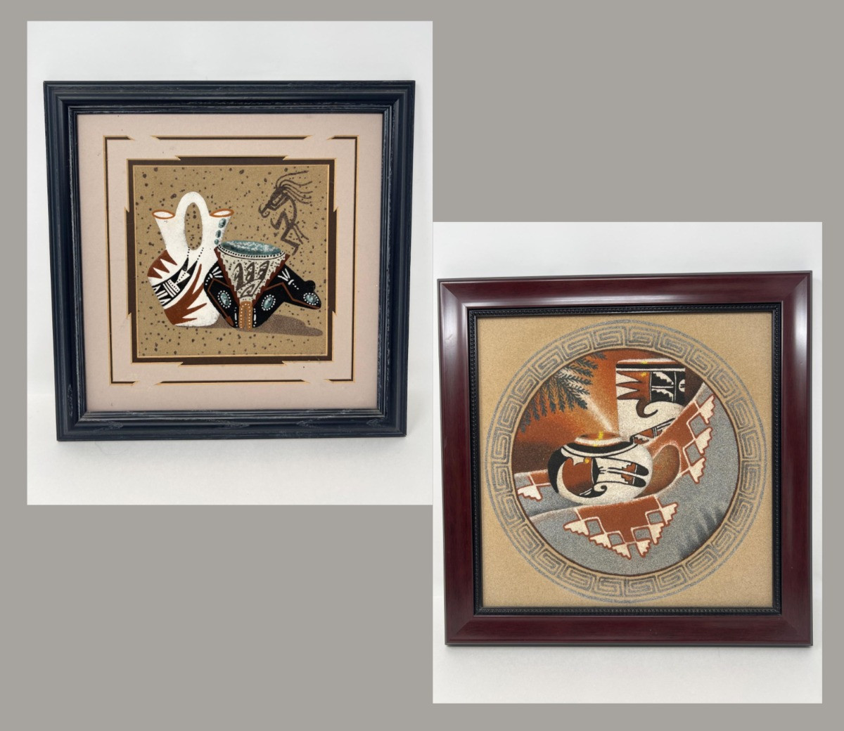 Handmade sandpainting by Jonah Yazzie, Navajo with COA. Handmade sandpainting by C. Todacheeny “Hummingbird vase with a totem pottery”. Both are well-known pots in Navajo tribe. [PP]