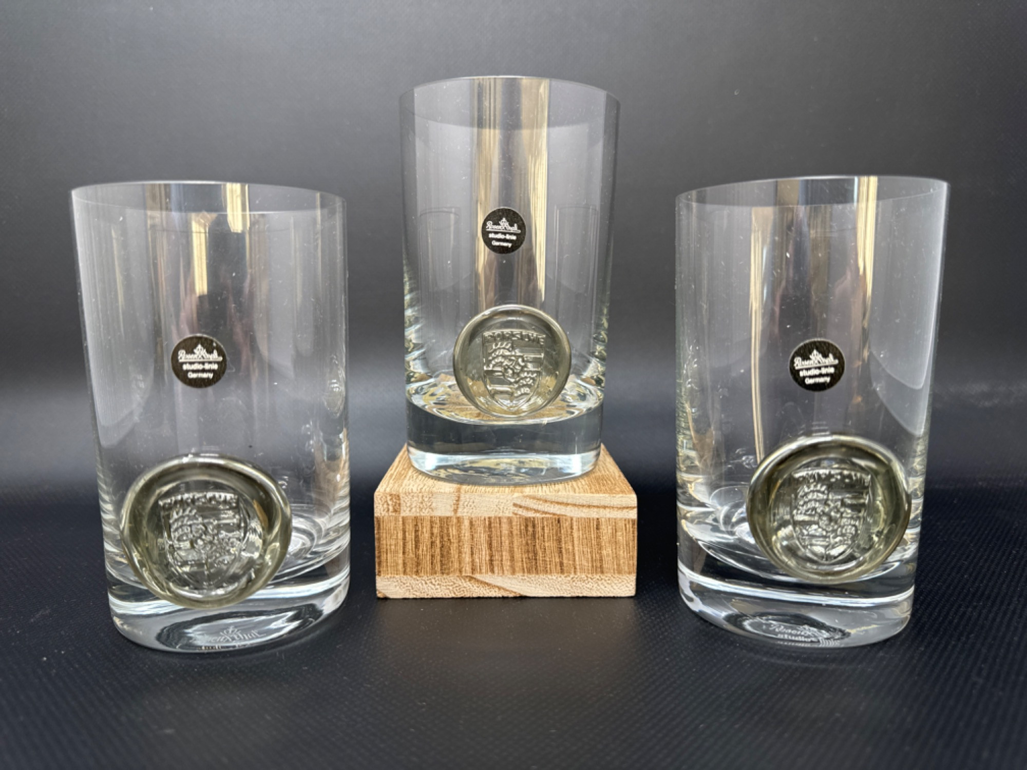 1960s Rosenthal Studio-Line Porsche Crest Cocktail Beer Glasses Set of 3 - comes in original packaging w/ stickers. Etched "Rosenthal Studio-Line on bases.