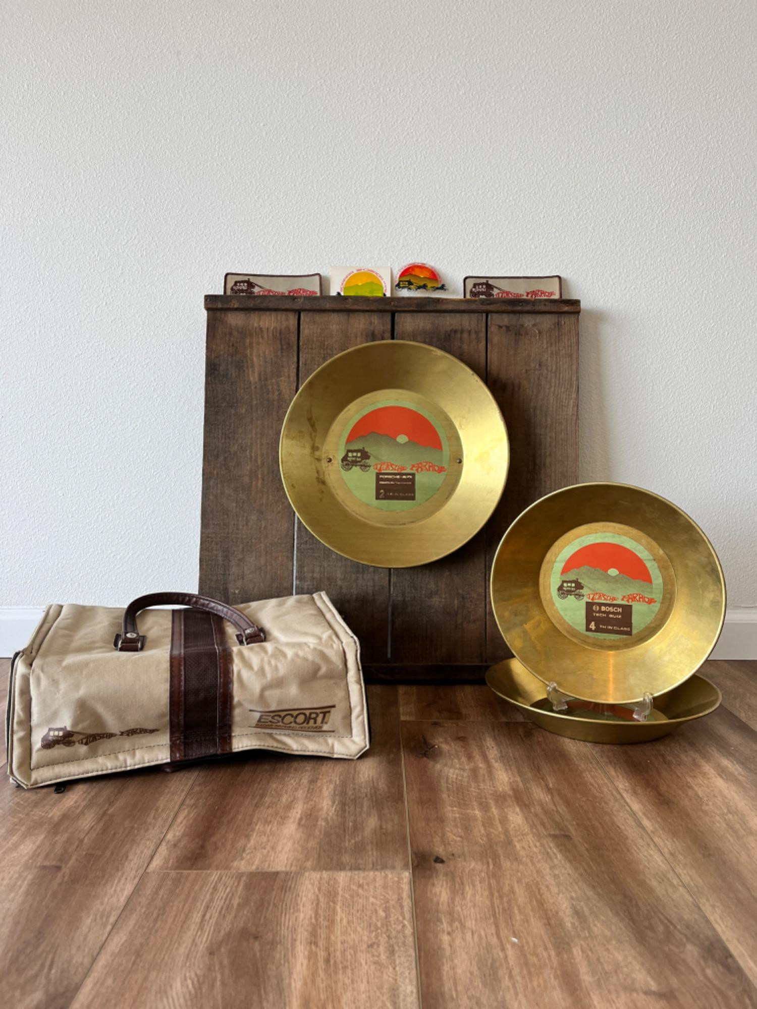 1982 Porsche Parade Reno Collection Includes 3 Trophies - one mounted on board. Escort Radar Receiver Bag, Decals, & Patches. All appear in good condition.
