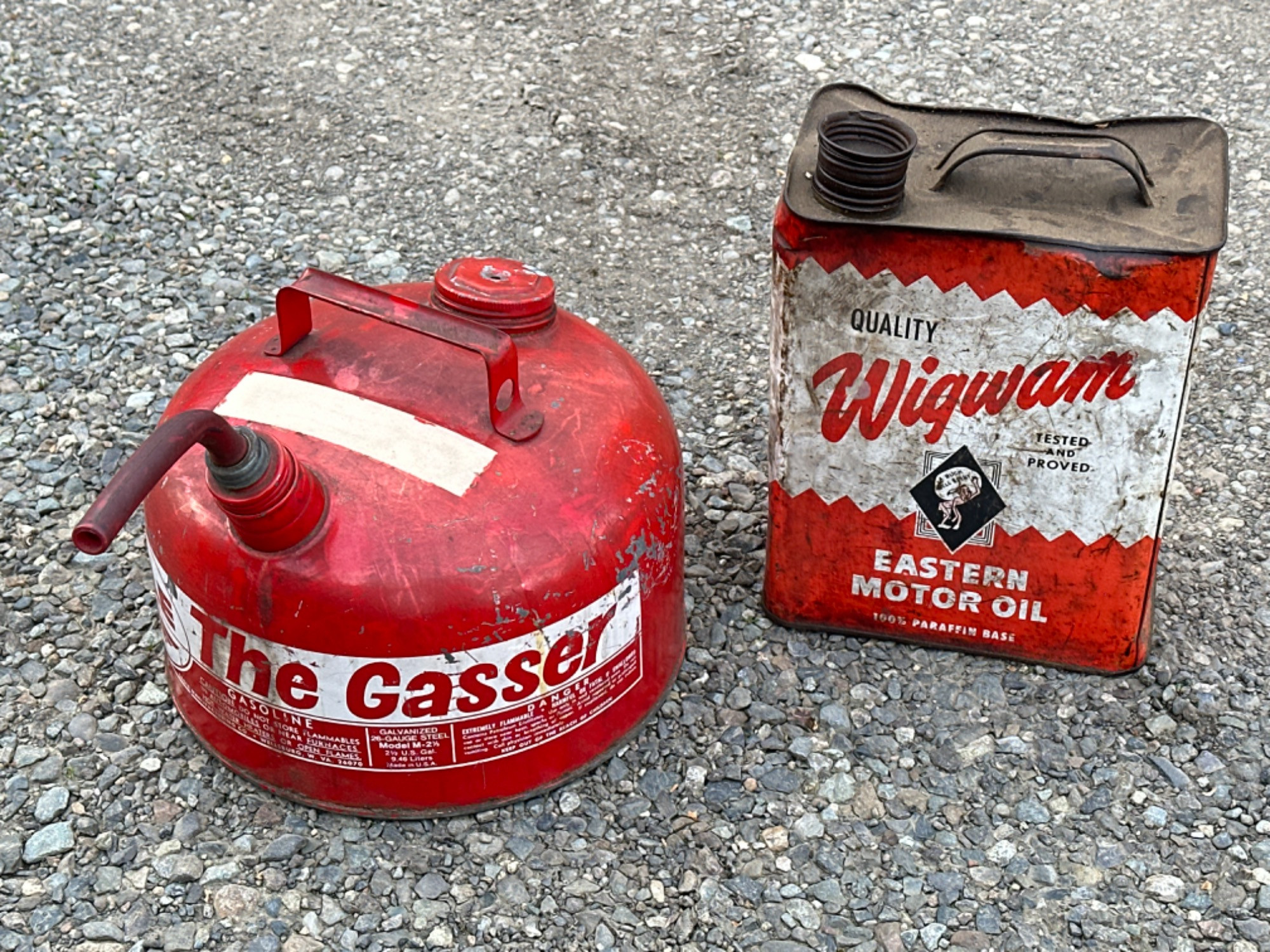 Vintage 2 1/2 gallon gas can 1 gallon motor oil can by Eastern Motor Oil Company