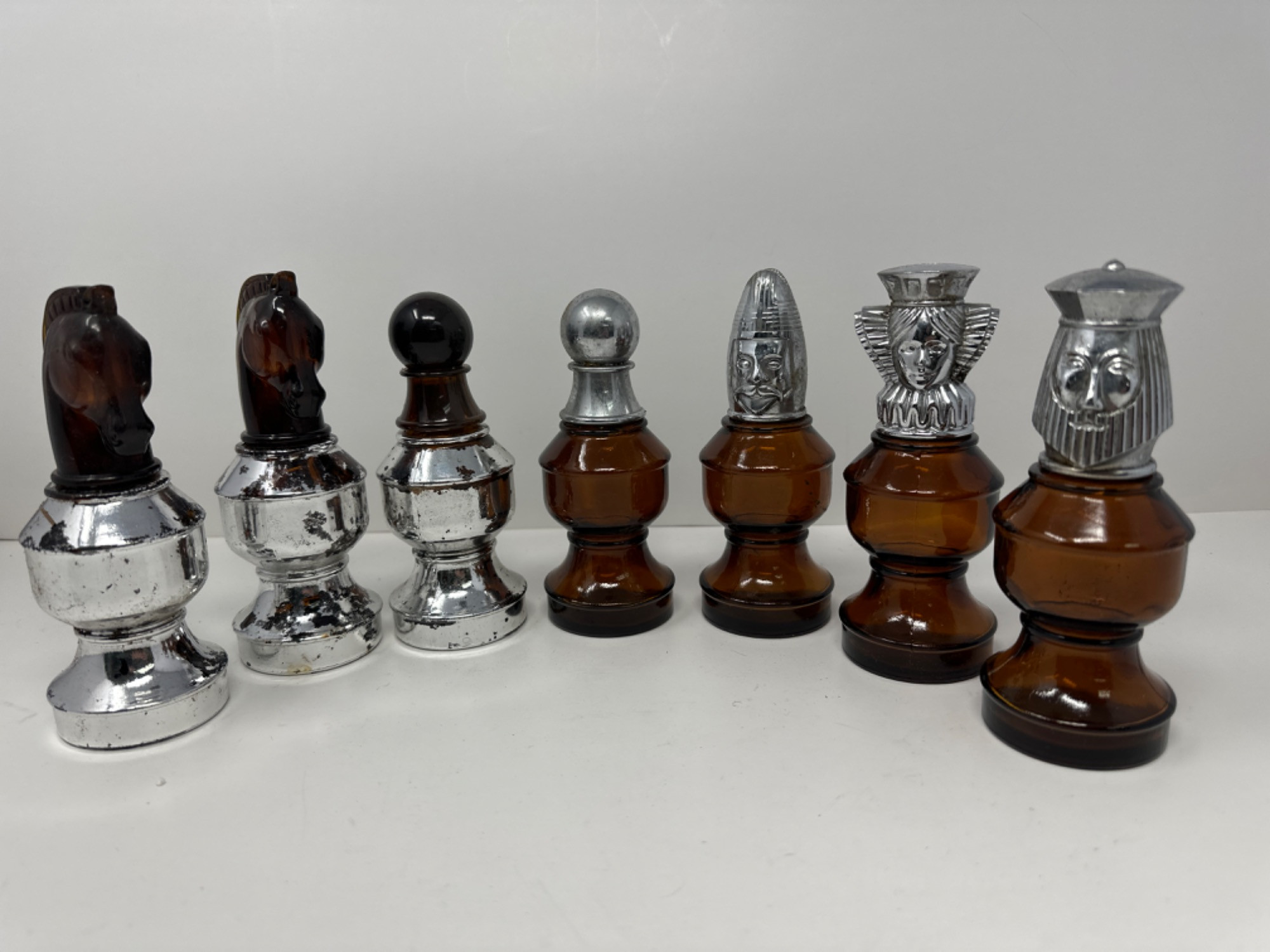 These vintage chess piece bottles are approximately 6 inches high, 2 inches wide
