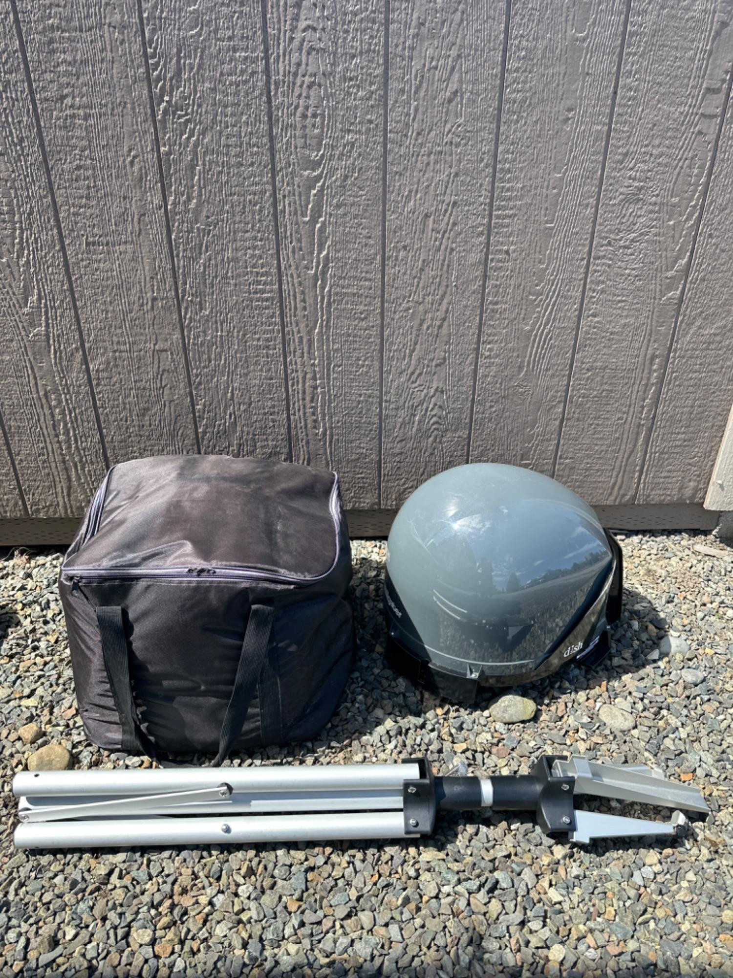 Portable RV Satellite dish with case and stand Dish: 13” tall 15” deep 12” wide Stand has a storage bag