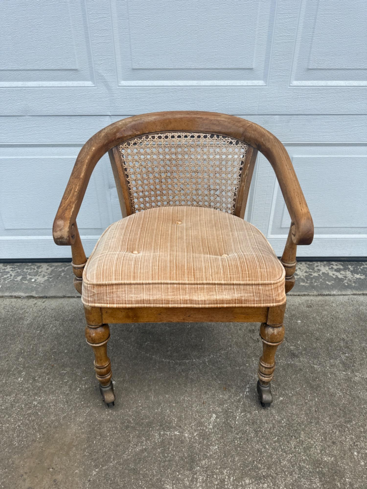 Wooden Cane Backed Vintage Chair Note- small black marks on cushion wheels on front 2 legs Approximately 25” tall, 22” wide, 21 1/2” deep
