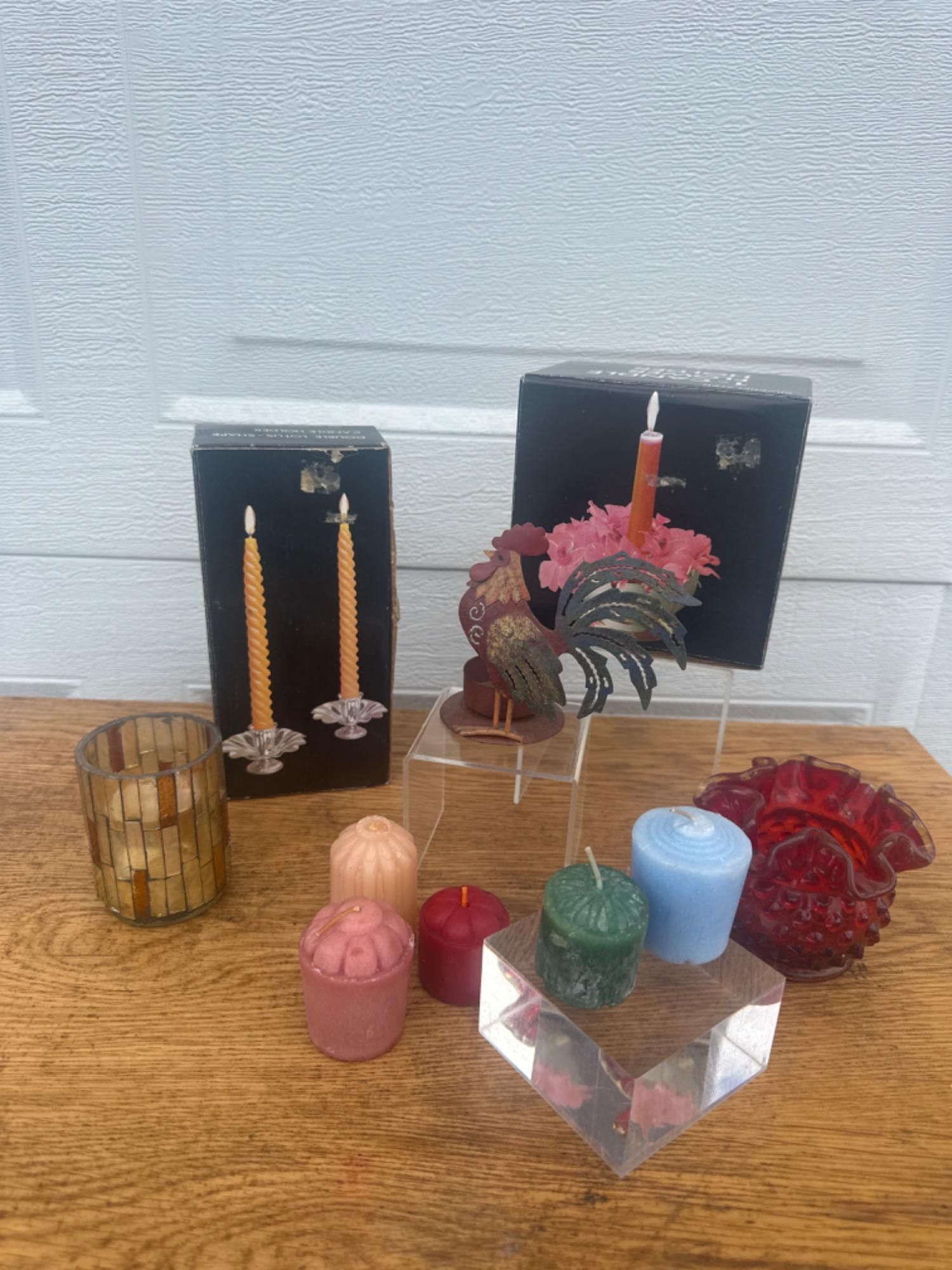Glass and silver plated candle holders (some new in box) Candle holders and funky wax mold candles box