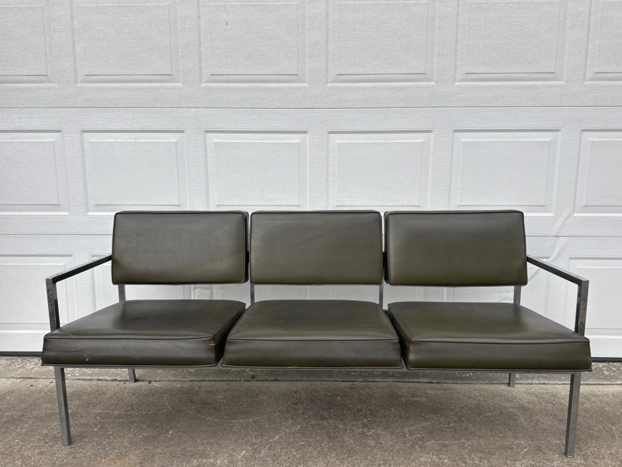 Mid-century modern green vinyl couch approximately 31 inches tall 70 inches wide 24 feet deep