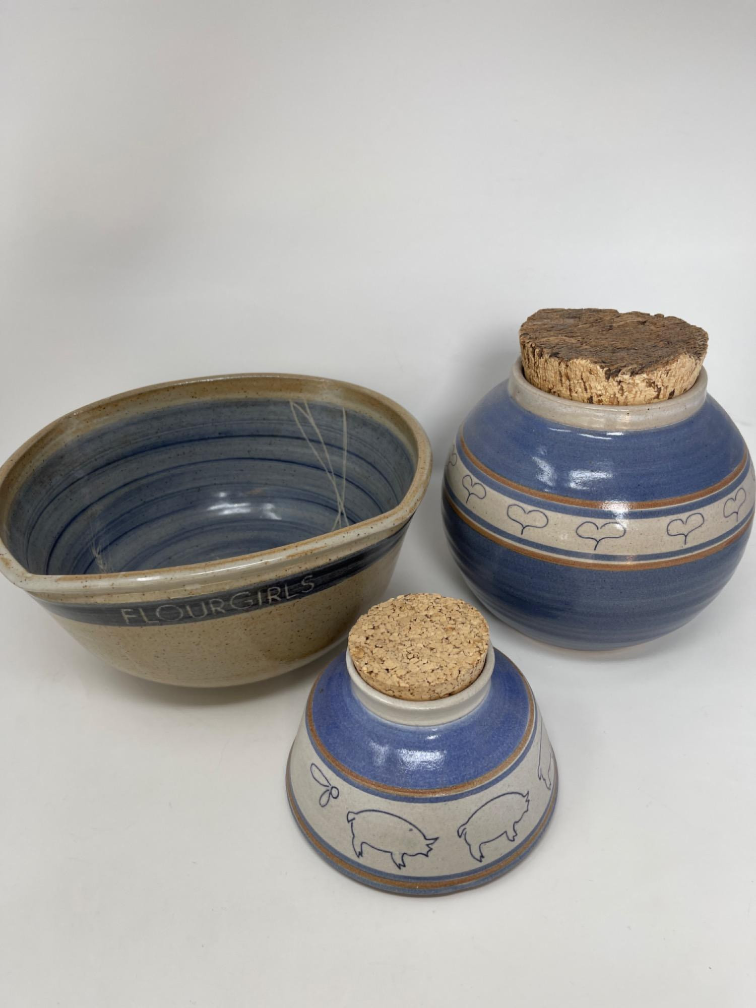 Flourgirls bowl: 11.5 inches wide at largest point x 5.5 inches tall Large Burke Jar: 7.5 inches x 8 inches Small Burke Jar: 6 inches x 3 inches Needs cleaning but in good condition.