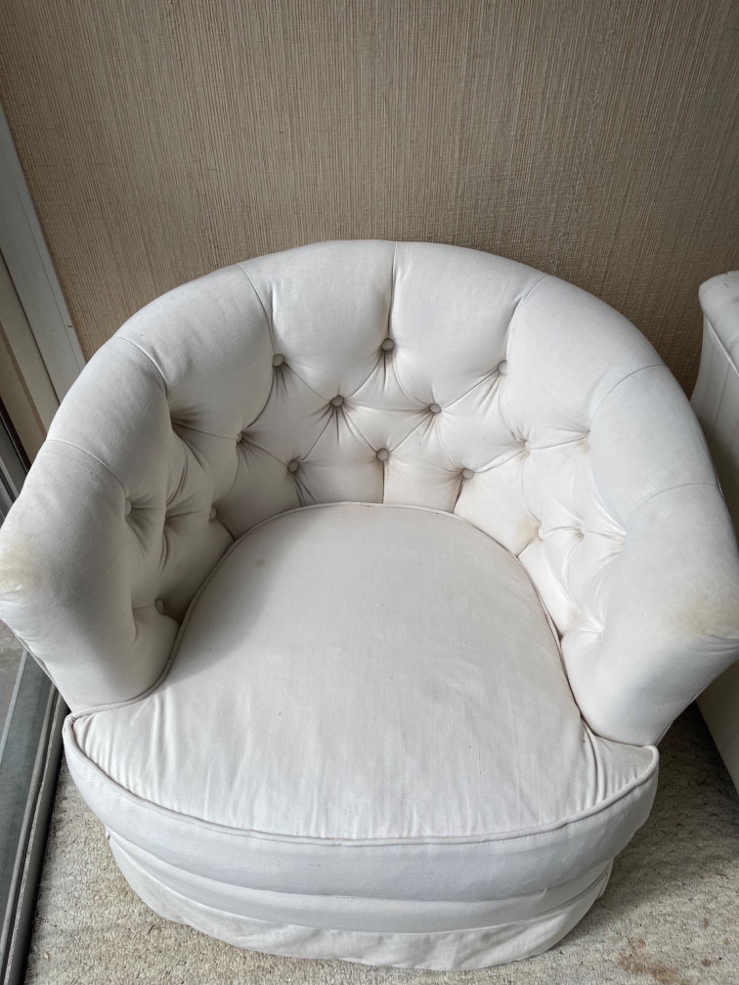 Measurements: 30 inches x 30 inches x 28 inches Multiple stains both to cushion and chair itself, as well as some minor snagging. Bidding on this lot is an agreement that: (1.) You